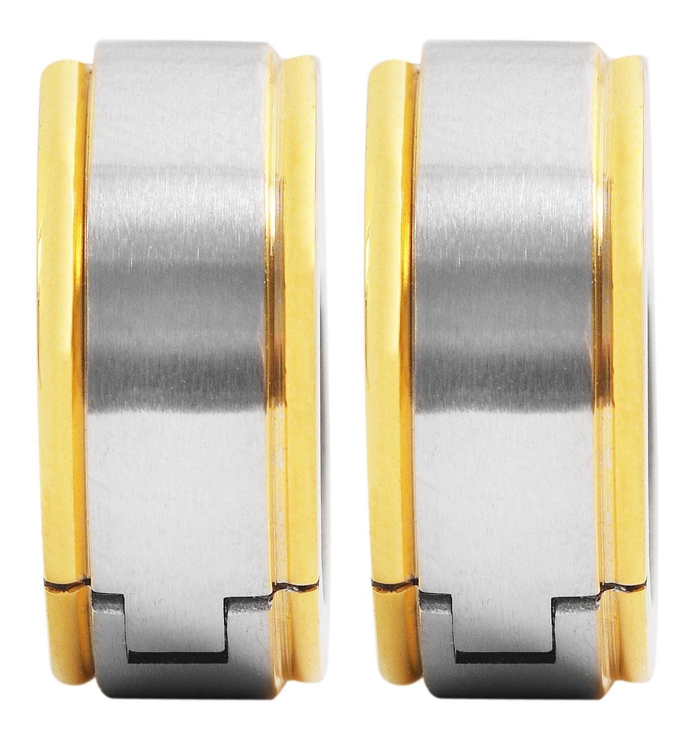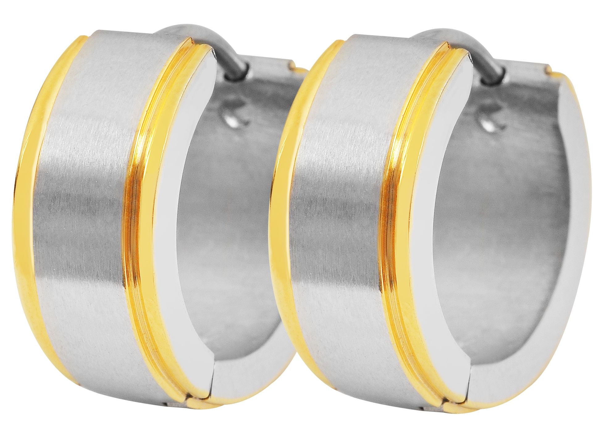 De tweekleurige scharnierende hoepeloorbellen van het merk Akzent zijn gemaakt van roestvrij staal en zijn bovendien afgewerkt met ion-plating. Het zilverkleurige middenstuk van de oorbellen heeft een matte roestvrijstalen afwerking, terwijl langs de buitenrand twee glanzende goudkleurige lijnen lopen. De oorsieraden kunnen worden bevestigd met een roestvrijstalen sluiting. De eenvoudige en tijdloze hoepeloorbellen zijn een geweldige metgezel voor elke dag, maar ook voor feestelijke gelegenheden. De maat resulteert uit een diameter van 12 mm, een breedte van 7 mm en een dikte van 2 mm.