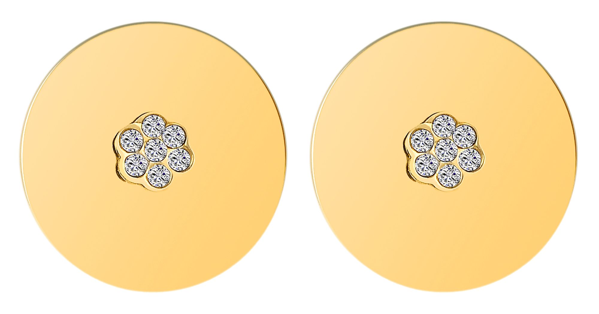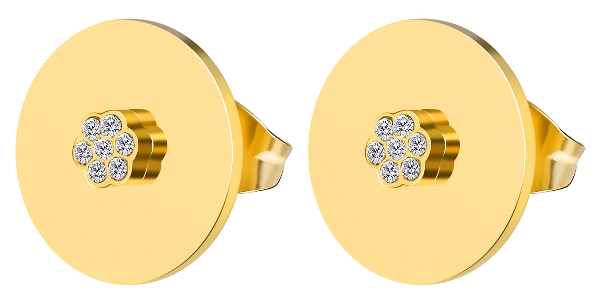 Productinformatie "Accent oorstekers, roestvrij staal, bloemvormige similé zetting, rond, goudkleurig"