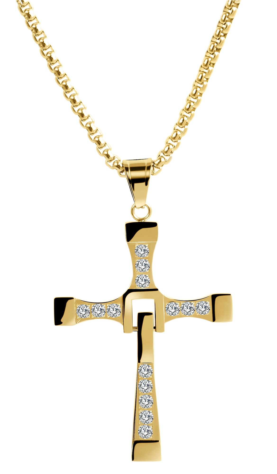 De goudkleurige Venetiaanse ketting van het merk Akzent is gemaakt van roestvrij staal, hoogglans gepolijst en voorzien van een IPG-coating. Hij is 61 cm lang, 3,5 mm breed en heeft een dikte van 3,5 mm. De bijpassende kruis hanger is ook gemaakt van roestvrij staal en versierd met similli stenen. De afmetingen van de hanger zijn 57 mm lang, 40 mm breed en 3 mm dik. De ketting kan worden geopend en gesloten met een roestvrijstalen karabijnsluiting.