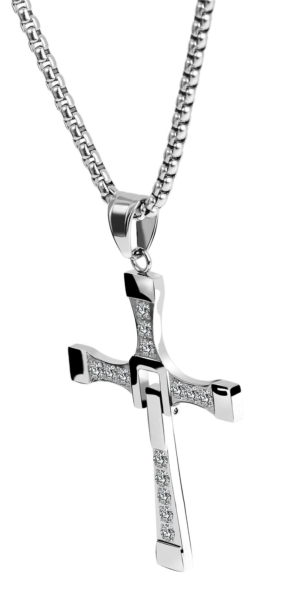De zilverkleurige Venetiaanse ketting van het merk Akzent is gemaakt van roestvrij staal. Hij is 61 cm lang, 3,5 mm breed en heeft een dikte van 3,5 mm. De bijpassende kruis hanger is ook gemaakt van roestvrij staal, hoogglans gepolijst en versierd met soortgelijke stenen. De afmetingen van de hanger zijn 57 mm lang, 40 mm breed en 3 mm dik. De ketting kan worden geopend en gesloten met een roestvrijstalen karabijnsluiting.