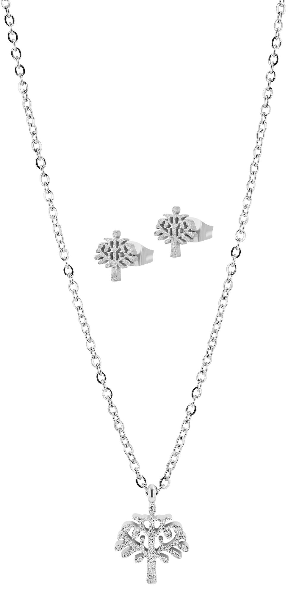 Deze stijlvolle set van hoogwaardig roestvrij staal biedt een harmonieuze combinatie van een 45 cm lange halsketting met hanger en bijpassende oorstekers, beide versierd met het motief van een levensboom. De set is gemaakt van roestvrij staal en wordt gekenmerkt door zijn duurzaamheid. Het is ook gemakkelijk te onderhouden en hypoallergeen. De lichtheid van het materiaal zorgt voor een aangenaam draagcomfort en een duurzame kwaliteit. Het oppervlak van de sieradenset is gezandstraald, waardoor een gestructureerde, matte look ontstaat.