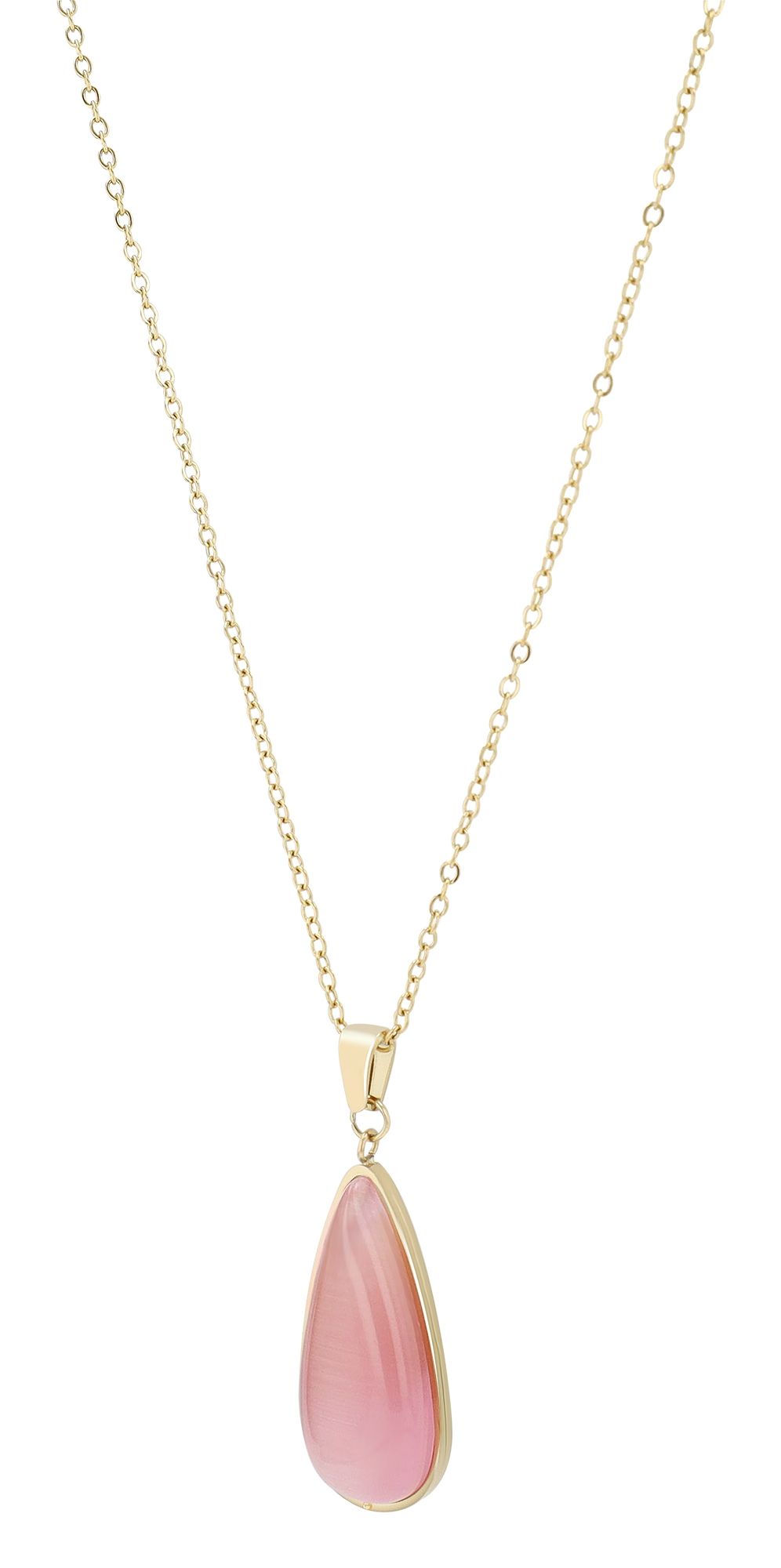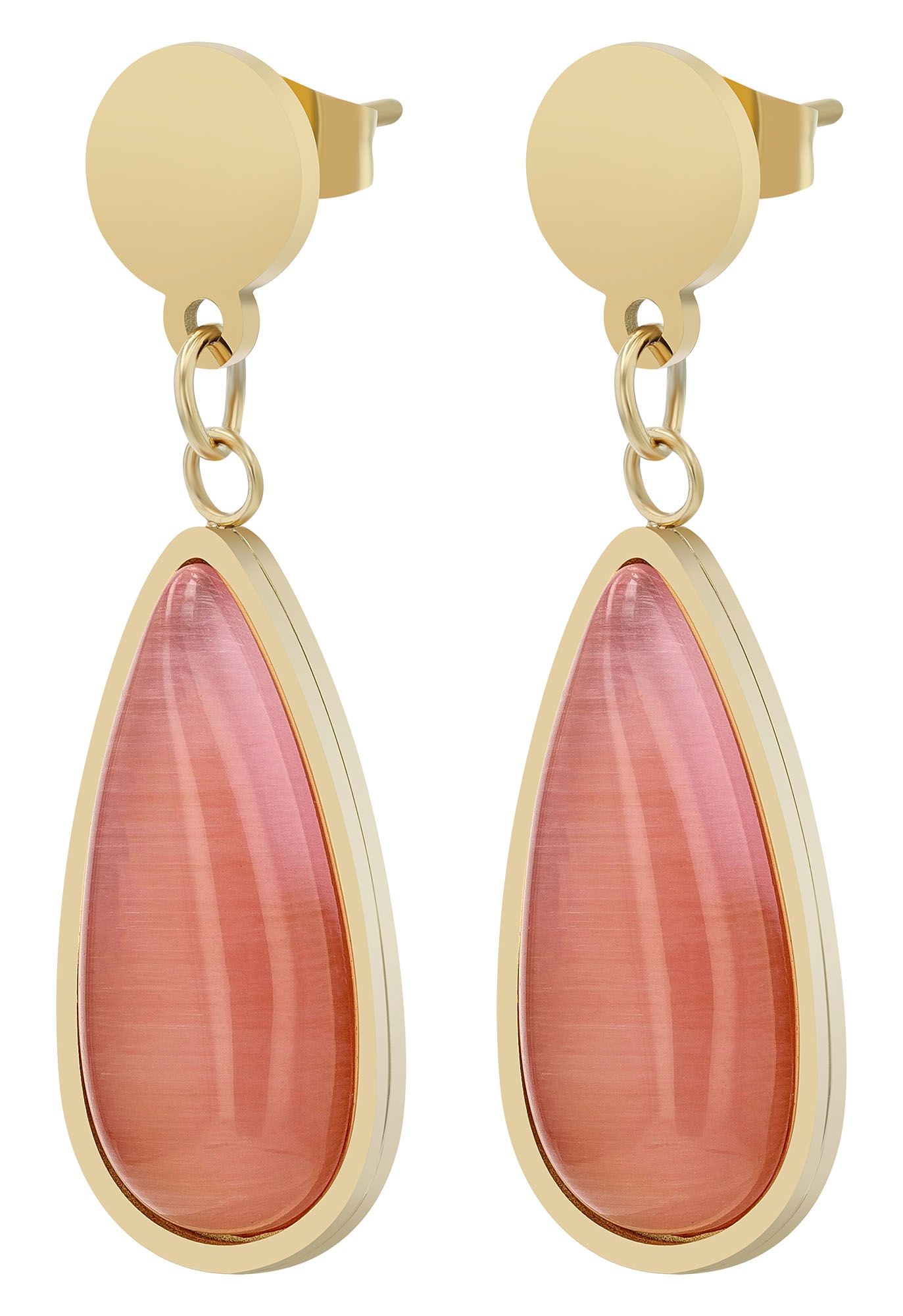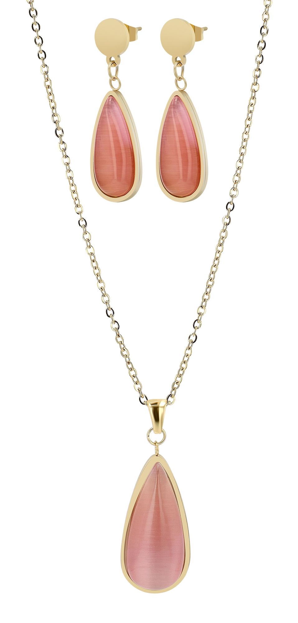 De ketting is 45 cm lang en wordt stevig gesloten met een karabijnsluiting. De focus ligt op de druppelvormige hanger die aan de ketting bungelt. Deze hanger, versierd met een kattenoog, heeft royale afmetingen van 32 x 14,5 x 5,5 mm. De bijpassende oorbellen hebben dezelfde druppelvormige elementen. Het bijzondere aan deze oorbellen is dat ze zachtjes meedeinen met elke beweging van de drager. Met een totale lengte van 35 mm, een breedte van 11 mm en een dikte van 4,5 mm hebben ze harmonieuze proporties. Ze worden aan het oor bevestigd met een vleugelschroef en een extra oormoer met een siliconen plaatje, die niet alleen zorgt voor een stevige grip, maar ook comfortabel is om te dragen.