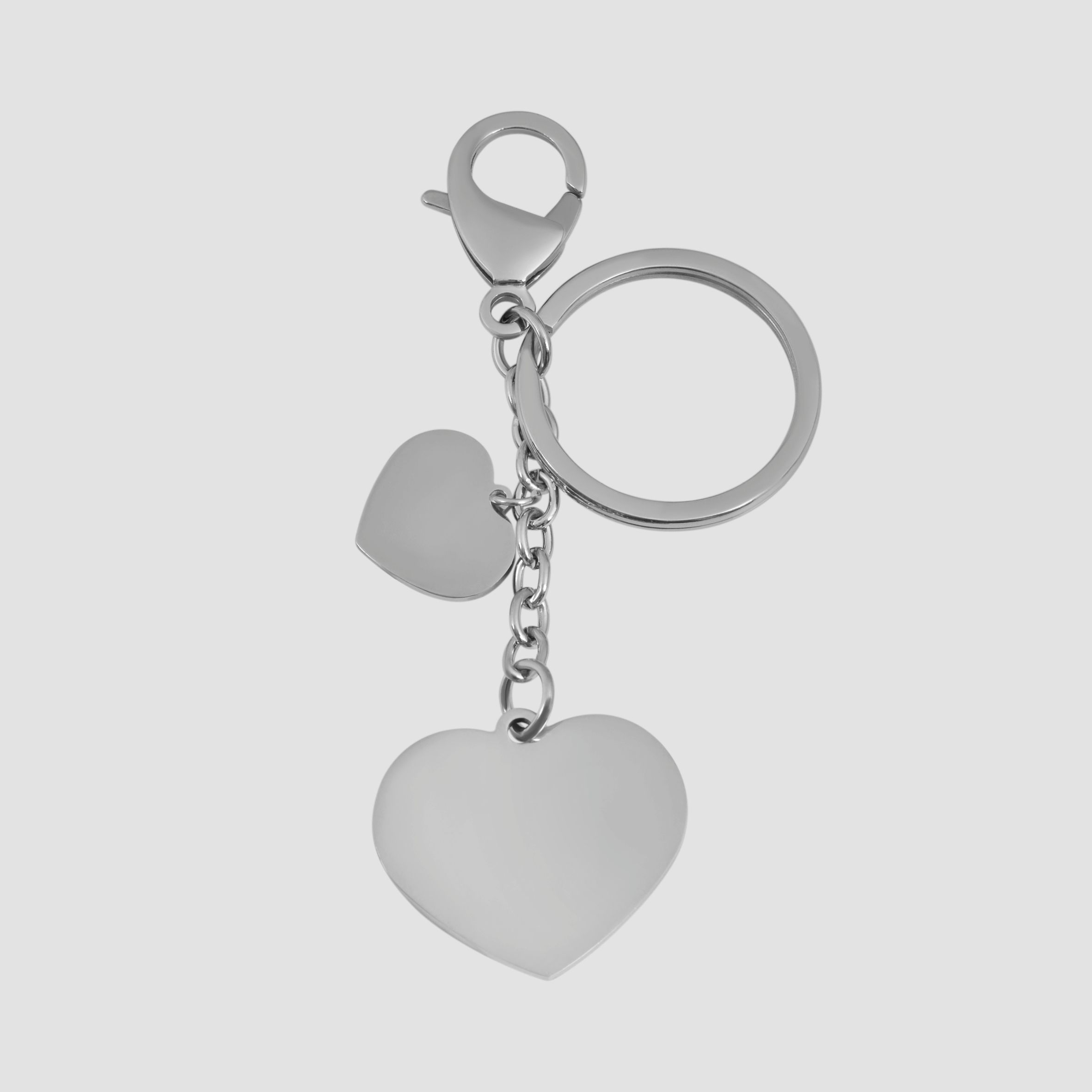 De sleutelhanger van het merk Akzent is gemaakt van roestvrij staal en is zilverkleurig. De hanger heeft de vorm van een hart en een tweede hartvormige hanger is bevestigd aan de roestvrijstalen oogjes. Het is perfect als gepersonaliseerd cadeau, want de hanger is een hoogglans gepolijst graveerplaatje met een lengte van 26 mm, een breedte van 30 mm en een dikte van 2 mm. De tweede kleinere hanger is 15 mm lang, 19 mm breed en 1 mm dik. De hanger kan aan beide zijden worden gegraveerd en is zeer robuust omdat hij van roestvrij staal is gemaakt. De hanger is bevestigd aan een sleutelhanger met acht roestvrijstalen oogjes. Deze heeft een diameter van 30 mm en is ook gemaakt van roestvrij staal en zeer robuust. Deze sleutelhanger is een prachtig accessoire dat elke sleutelbos verfraait.