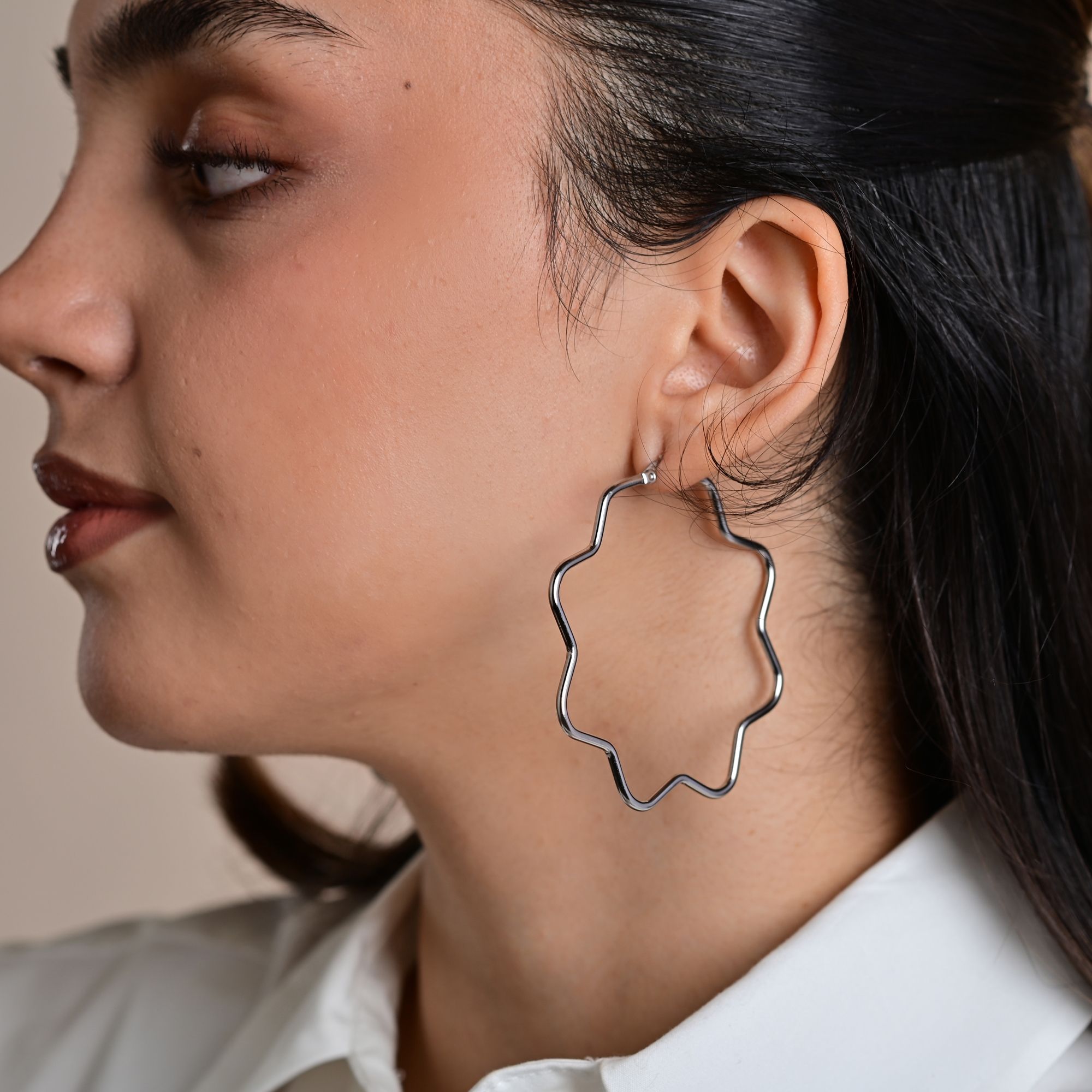 De zilverkleurige hoepeloorbellen van het merk Akzent zijn gemaakt van roestvrij staal en hebben de vorm van een bloem. Ze zijn bovendien hoogglans gepolijst en kunnen worden geopend en gesloten met een clipsluiting. De hoepeloorbellen zijn 65 mm lang, 2 mm breed en 2 mm dik.