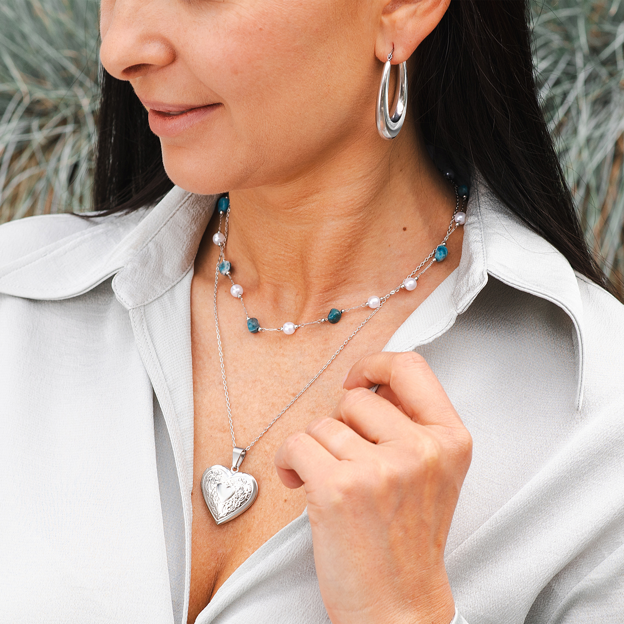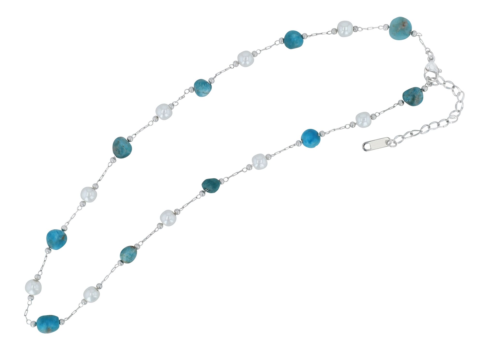 Met een lengte van 40 cm en een verlengstuk van 5 cm biedt deze ketting een perfecte pasvorm en veel draagmogelijkheden. De karabijnsluiting zorgt er niet alleen voor dat hij goed vastzit, maar maakt het ook gemakkelijk om hem om te doen en af te doen. Het pronkstuk van deze ketting zijn de tien lichtblauwe natuurstenen, elk een natuurlijk kunstwerk met zijn eigen individuele schoonheid. Ze zijn in verschillende groottes gerangschikt en geven de ketting een ongeëvenaarde esthetiek en diepte. Ze worden aangevuld door negen zoetwaterparels, elk uniek en van tijdloze schoonheid. Samen vormen ze een harmonieuze combinatie van natuurlijkheid en elegantie.