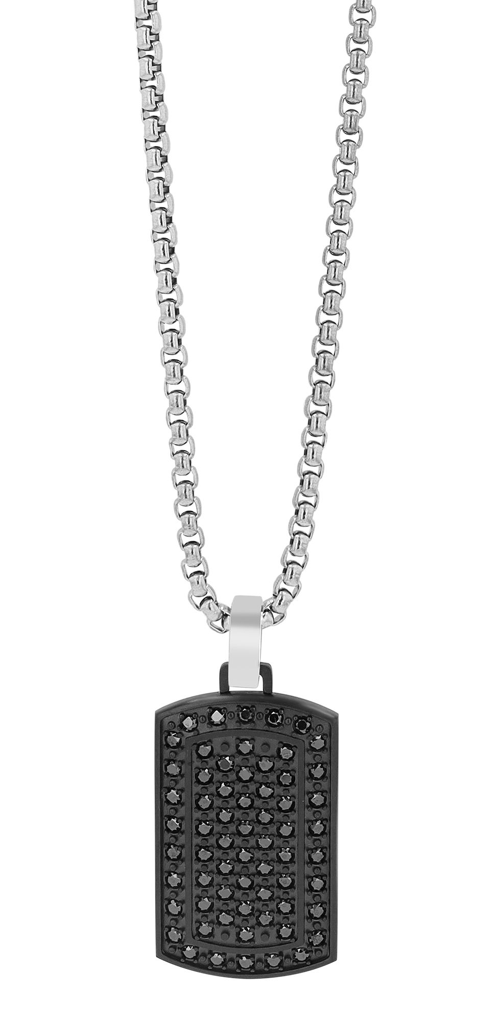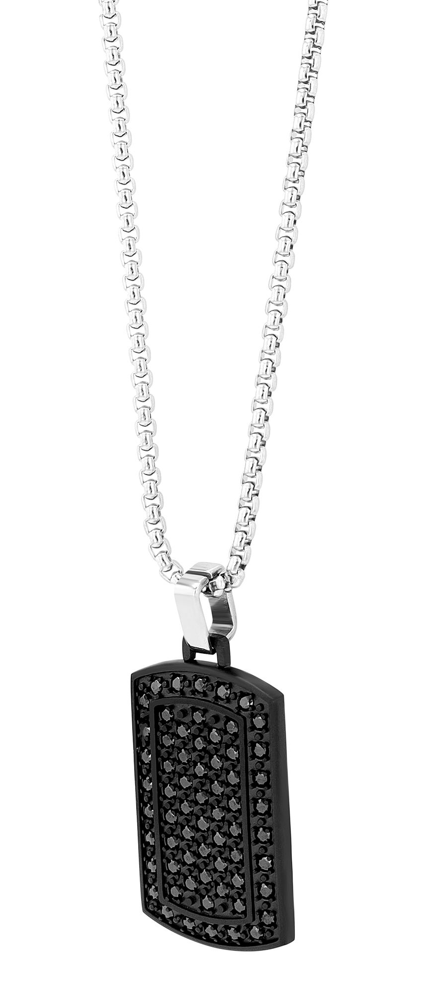 De zilverkleurige "Gadi" ketting van het merk Akzent belichaamt de tijdloze schoonheid van roestvrij staal, een materiaal dat niet alleen bekend staat om zijn robuustheid maar ook hypoallergeen is. De 3 mm dikke Venetiaanse ketting is 60 cm lang en kan worden geopend en gesloten met een roestvrijstalen karabijnsluiting. De karabijnsluiting maakt het niet alleen gemakkelijk om de ketting om te doen en af te doen, maar zorgt ook voor een stevige grip. De zwarte dog tag hanger met een lengte van 34 mm, een breedte van 19,5 mm en een materiaaldikte van 3 mm kan naar wens op de achterkant worden gegraveerd, waardoor het een individueel sieraad wordt. De voorkant van de hanger is ook versierd met fonkelende zwarte similstenen.