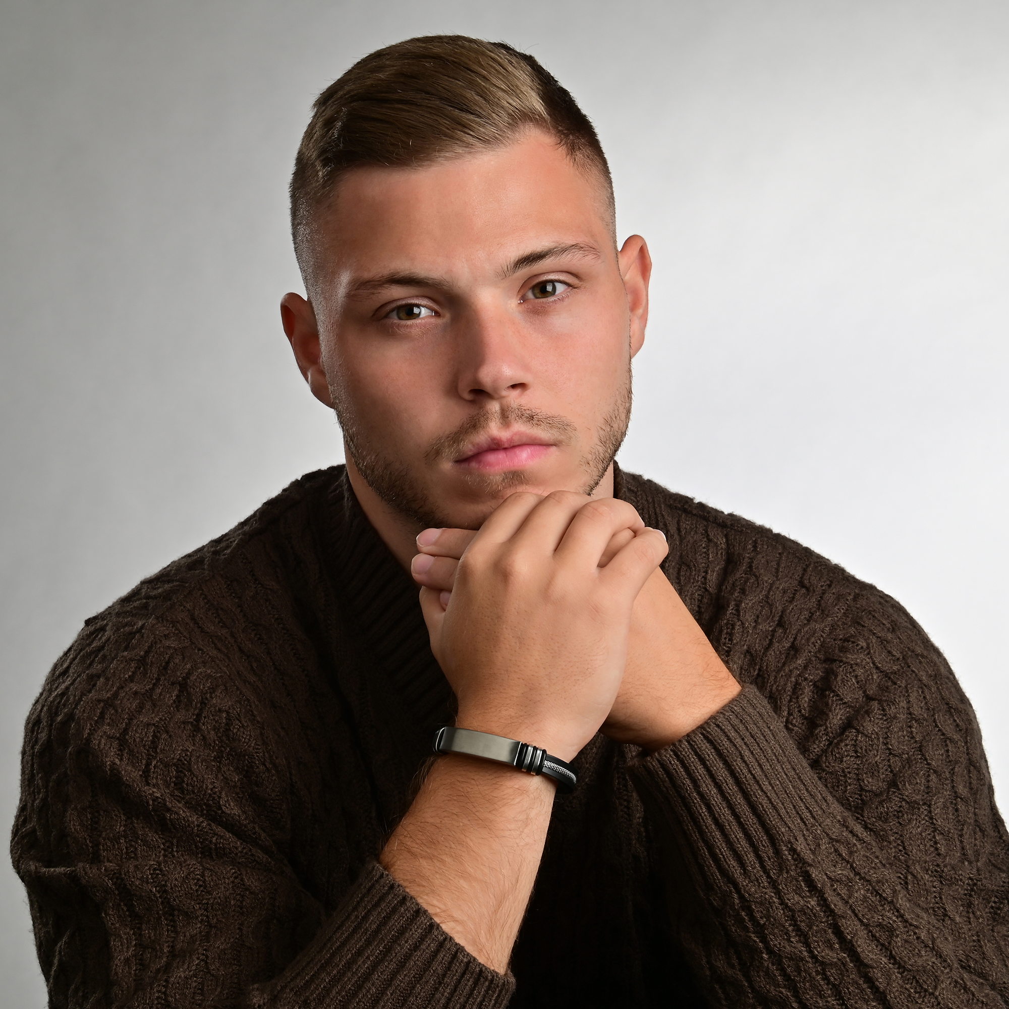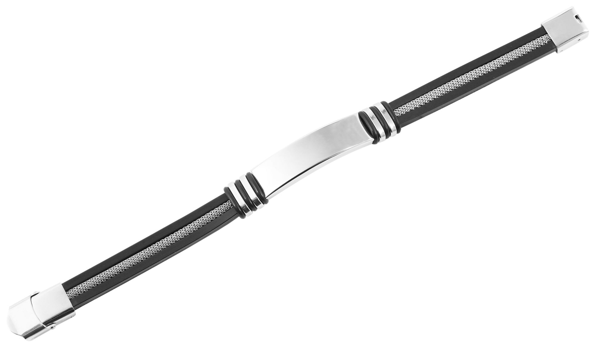 De Akzent merkarmband is gemaakt van siliconen. De elementen op de siliconen armband zijn gemaakt van roestvrij staal. De kleur is zwart met zilver. Het zilverkleurige identificatieplaatje in het midden van de band is geschikt voor allerlei gravures. Er is ook een kleine slangenketting in het midden van de siliconen. De armband is 20,5 cm lang en 9 mm breed. Zonder de sluiting is de totale lengte 18,5 cm. Het breedste deel is 5 mm dik. De sluiting is een roestvrijstalen haaksluiting.