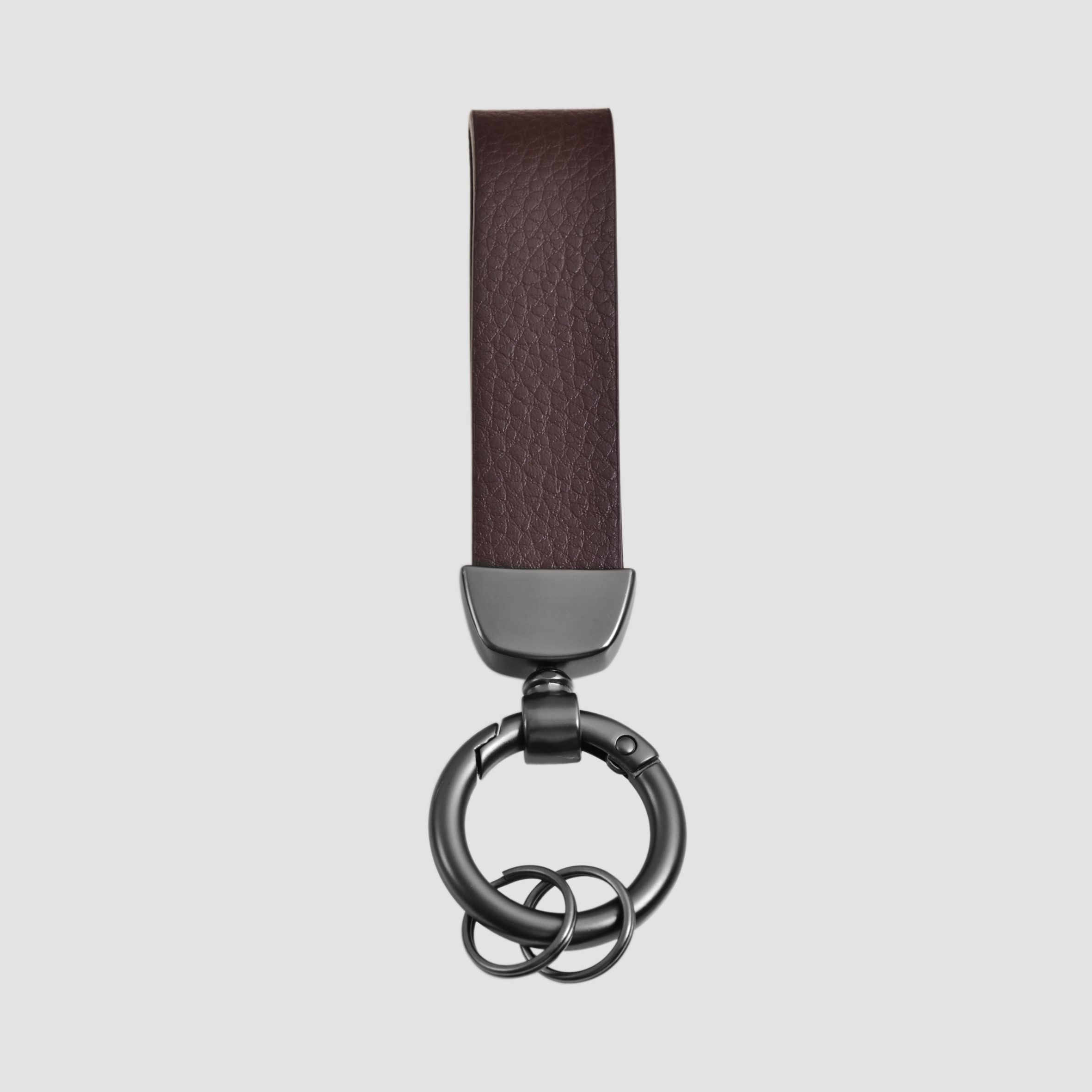 De sleutelhanger van het merk Akzent bestaat uit een bruine band van echt leer, een antracietkleurige karabijnring en twee antracietkleurige roestvrijstalen sleutelhangers. De leren riem wordt met twee kleine schroeven vastgeschroefd aan een roestvrijstalen element. Dit zorgt voor de nodige houvast en voorkomt dat de riem losschiet. De karabijnring heeft een diameter van 25 mm en een dikte van 5 mm. De sleutelhangers hebben een diameter van 13 mm en een dikte van 1,5 mm. De leren riem is 7,5 cm lang en 2,2 cm breed. De sleutelhanger heeft een totale lengte van 13 cm, het breedste punt is 3,5 cm en de materiaaldikte is 0,9 cm. Dankzij het eenvoudige ontwerp is de sleutelhanger een must-have voor elke sleutelbos en ideaal als cadeau.
