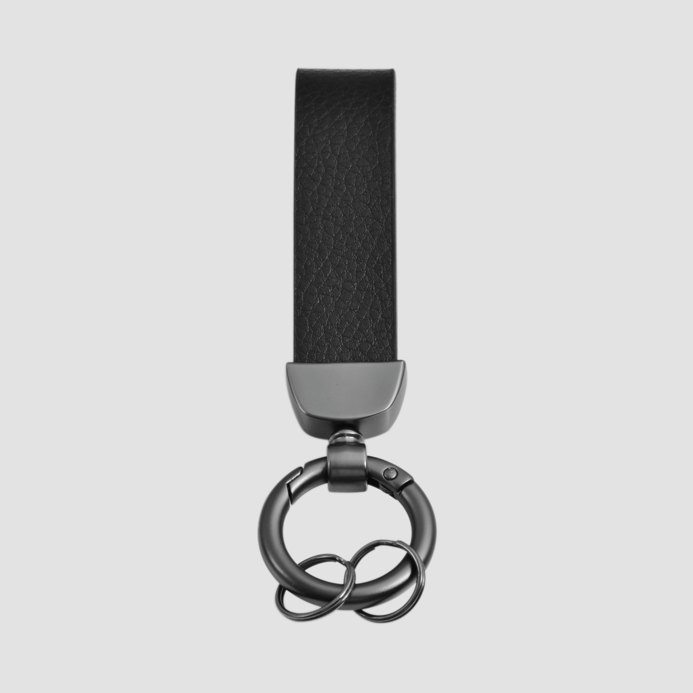 De sleutelhanger van het merk Akzent bestaat uit een zwarte band van echt leer, een antracietkleurige karabijnring en twee antracietkleurige roestvrijstalen sleutelhangers. De leren riem is met twee kleine schroeven bevestigd aan een roestvrijstalen element. Dit zorgt voor de nodige houvast en voorkomt dat de riem losschiet. De karabijnhaakring heeft een diameter van 25 mm en een dikte van 5 mm. De sleutelhangers hebben een diameter van 13 mm en een dikte van 1,5 mm. De leren riem is 7,5 cm lang en 2,2 cm breed. De sleutelhanger heeft een totale lengte van 13 cm, het breedste punt is 3,5 cm en de materiaaldikte is 0,9 cm. Dankzij het eenvoudige ontwerp is de sleutelhanger een must-have voor elke sleutelbos en ideaal als cadeau.