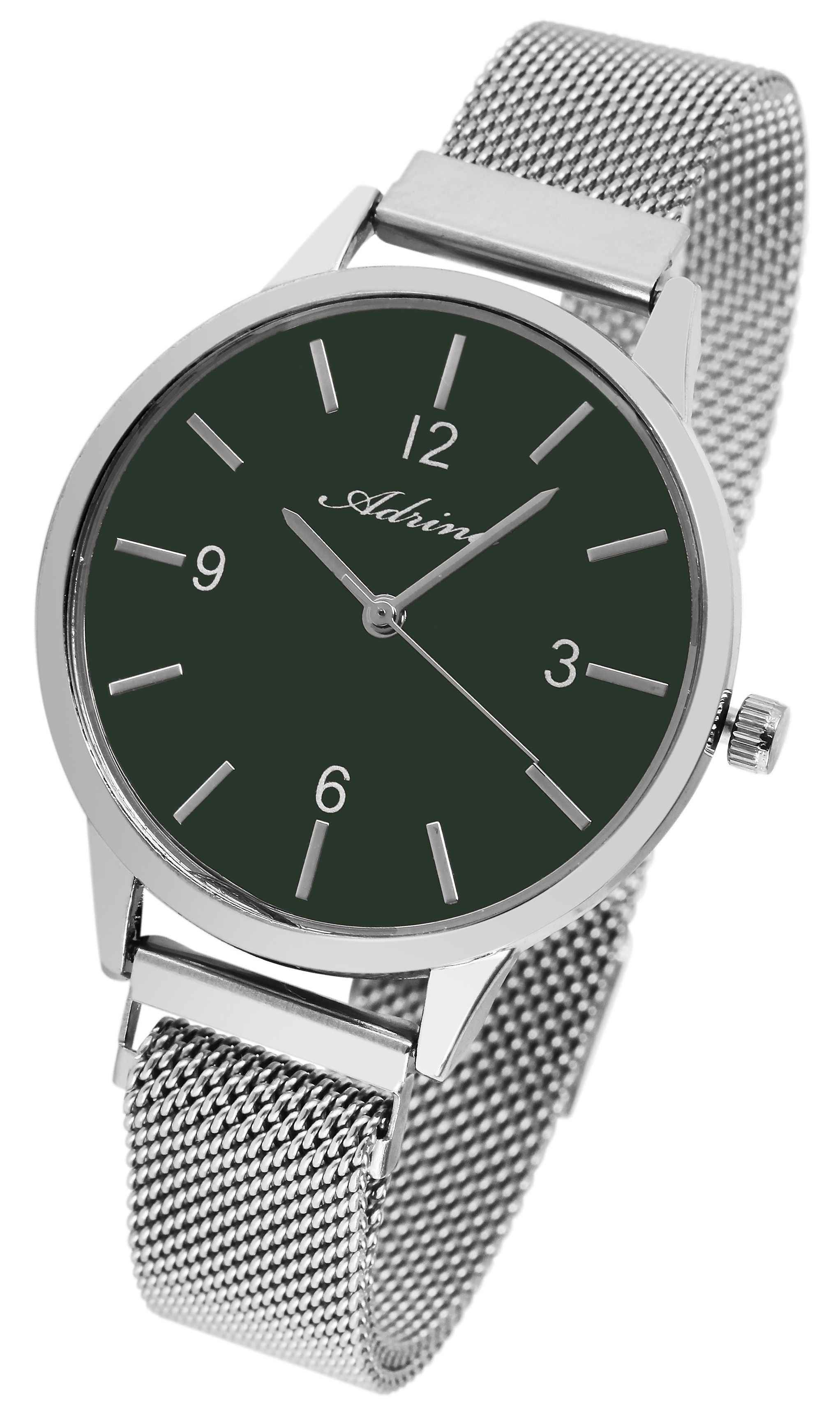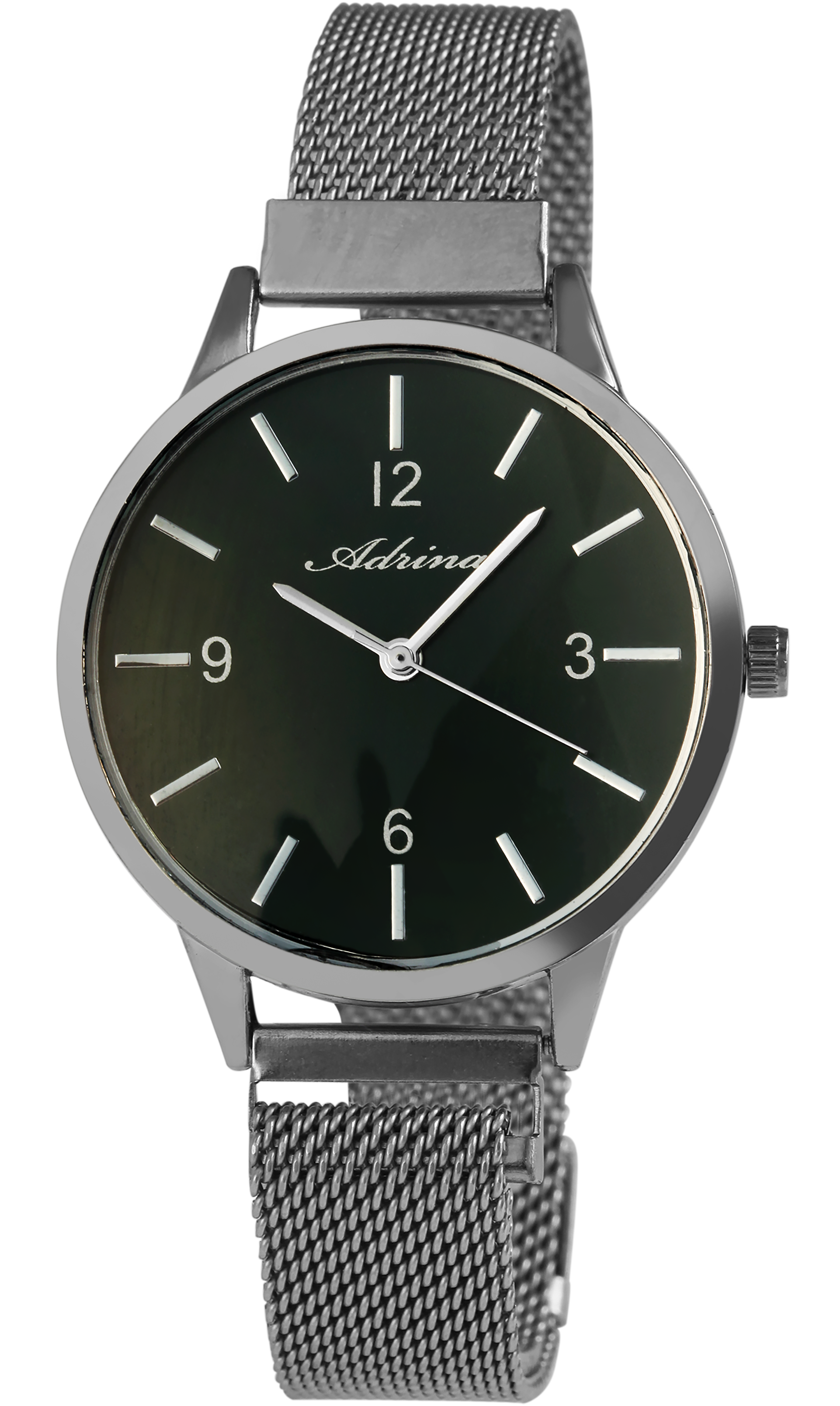 Het analoge 3-hands damespolshorloge van het merk Adrina heeft een hoogwaardig quartz uurwerk. De zilverkleurige Milanese band is 16 mm breed bij de lug en kan eenvoudig worden bediend met een magneetsluiting. De delicate roestvrijstalen armband is een geweldige blikvanger en geeft het dameshorloge een elegante en toch modieuze touch. Dankzij de praktische sluiting kan de lengte individueel worden aangepast aan elke drager. De totale lengte van het horloge is 27 cm. De zilverkleurige metalen kast met mineraalglas heeft een diameter van 37 mm en een kasthoogte van 9 mm. De achterkant van de kast is gemaakt van roestvrij staal. De eenvoudige groene wijzerplaat met duidelijke lijnindices blijft discreet op de achtergrond en geeft het horloge een stijlvolle uitstraling. Al met al is dit uurwerk niet alleen een betrouwbare metgezel, maar ook een geweldig accessoire dat om geen enkele pols mag ontbreken.