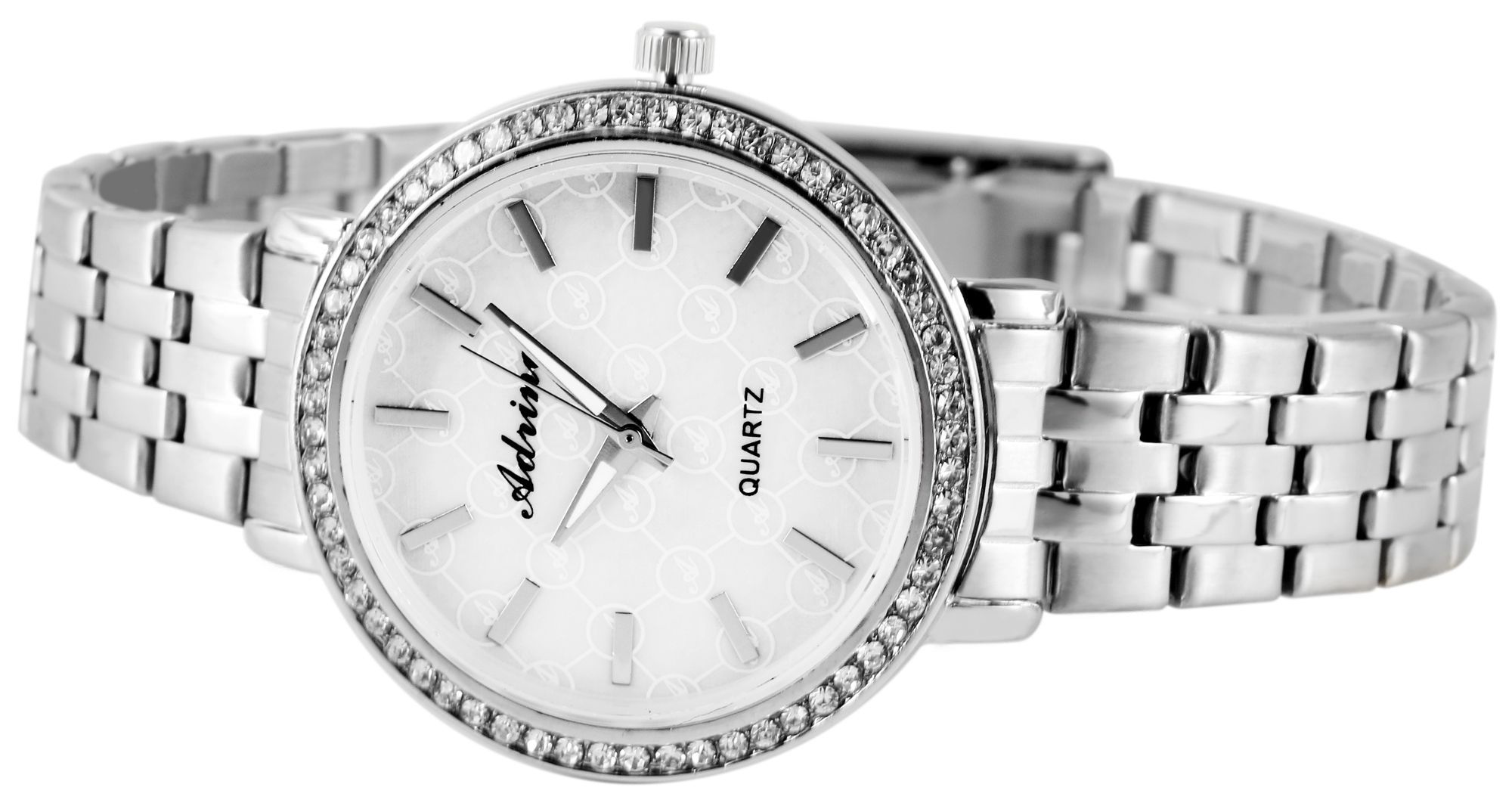 Het analoge dameshorloge van het merk Adrina heeft een hoogwaardig kwartsuurwerk. De modelaanduiding is AR0004. De roestvrijstalen armband is 16 mm breed en opent met een roestvrijstalen vouwsluiting. De totale lengte is 20 cm. De metalen kast met mineraalglas meet 36 mm en is 9 mm hoog. De kast is afgewerkt met kristal. De kastdeksel is gemaakt van roestvrij staal.