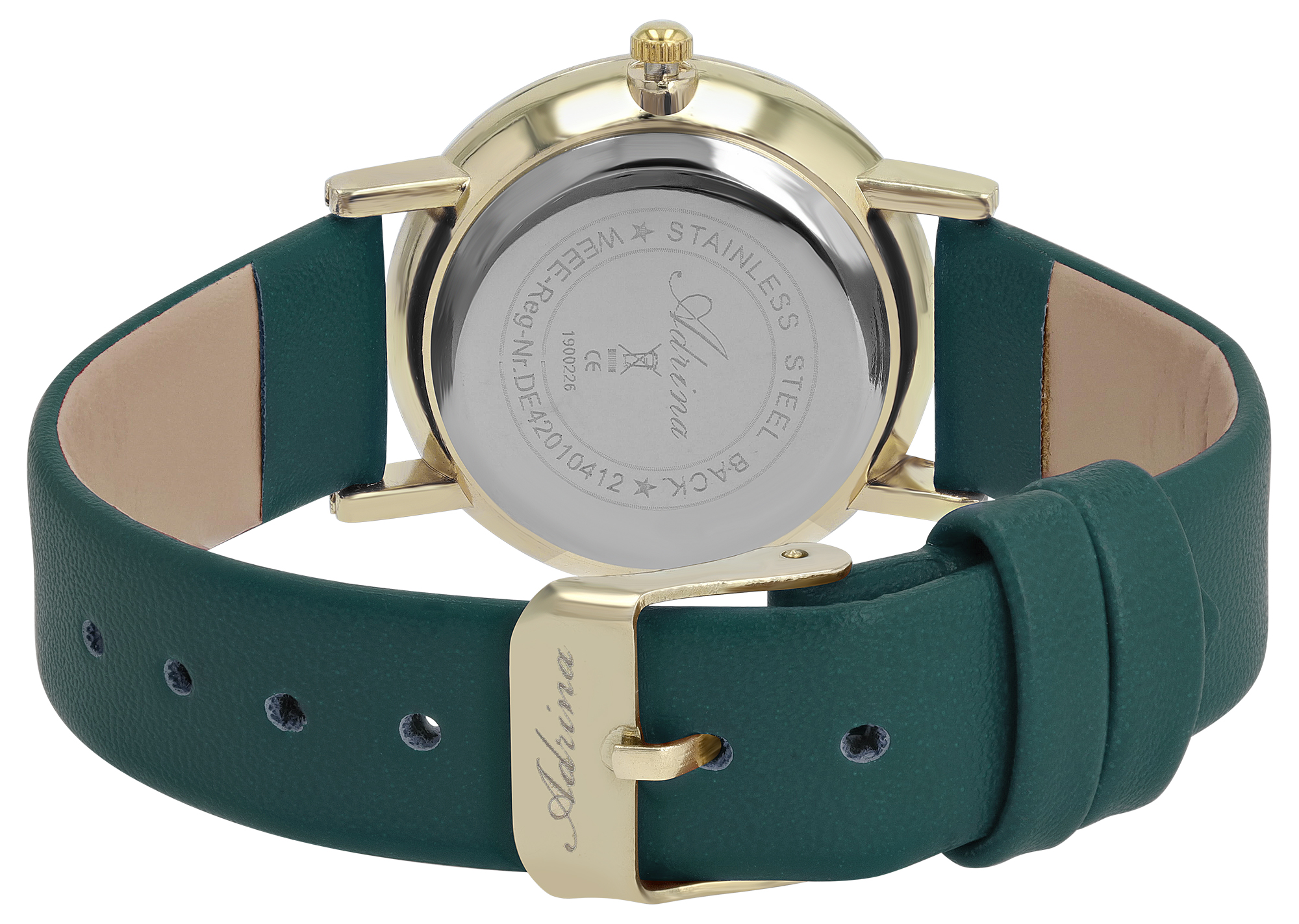 Productinformatie "Adrina Damenuhr mit Lederimitationsband, Ø 32 mm, grün/ goldfarben"