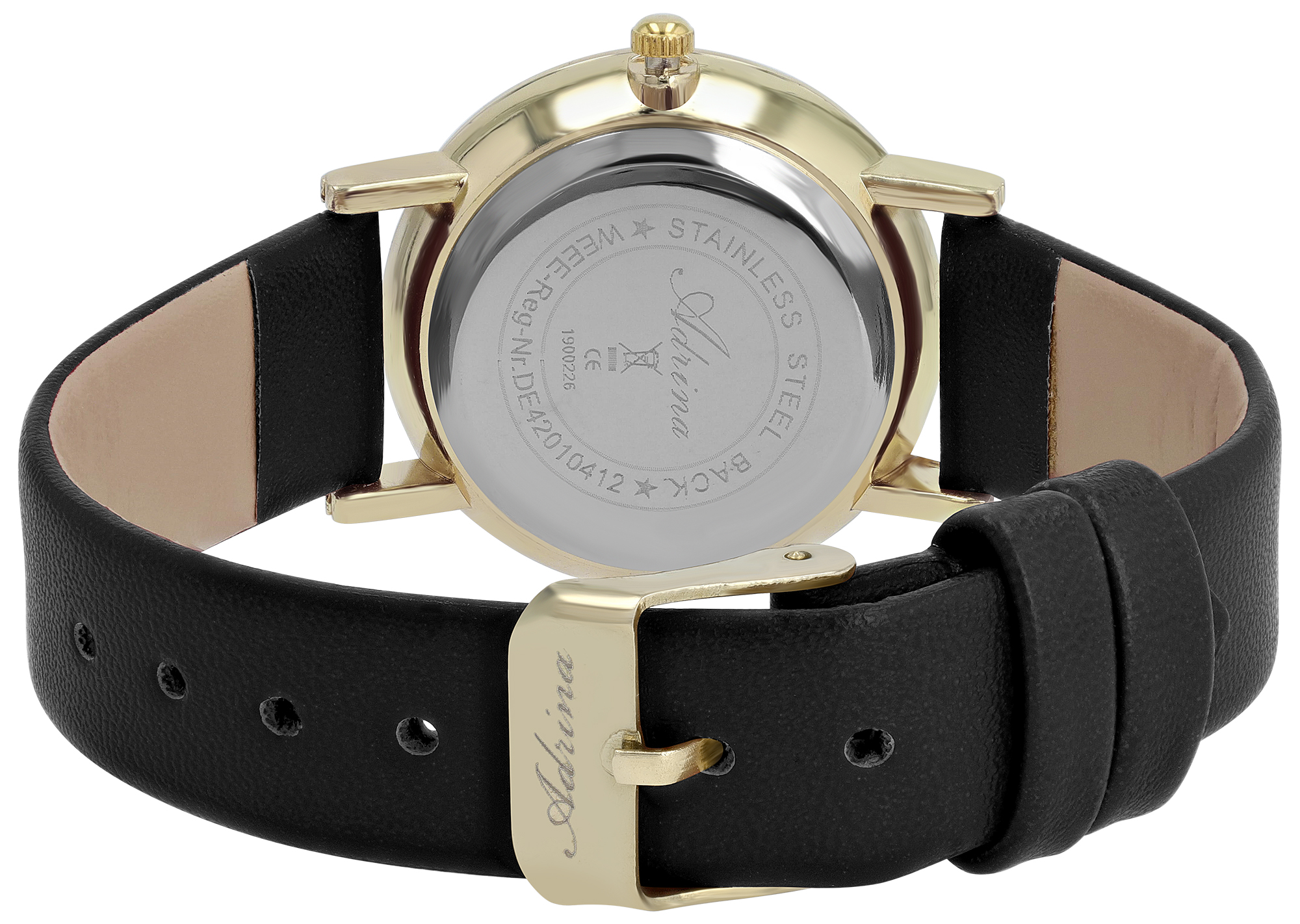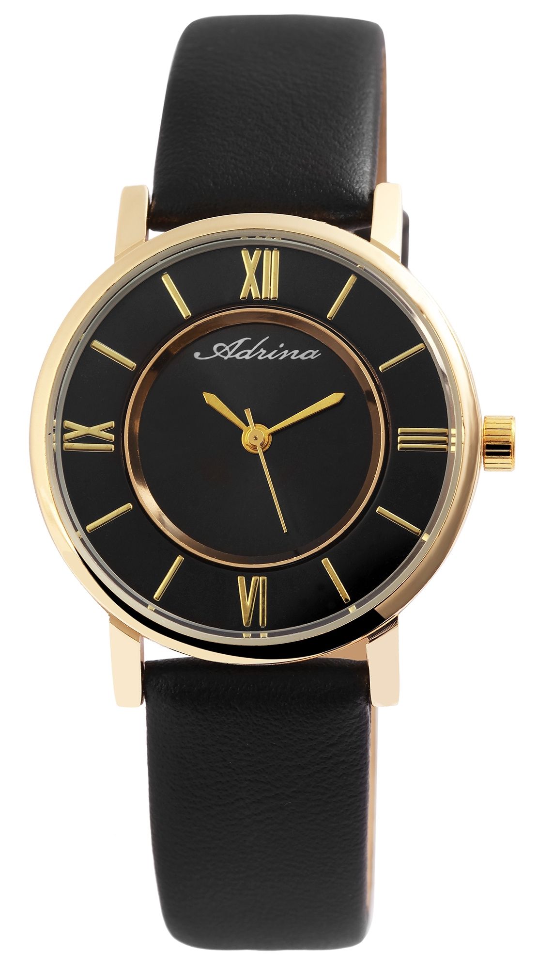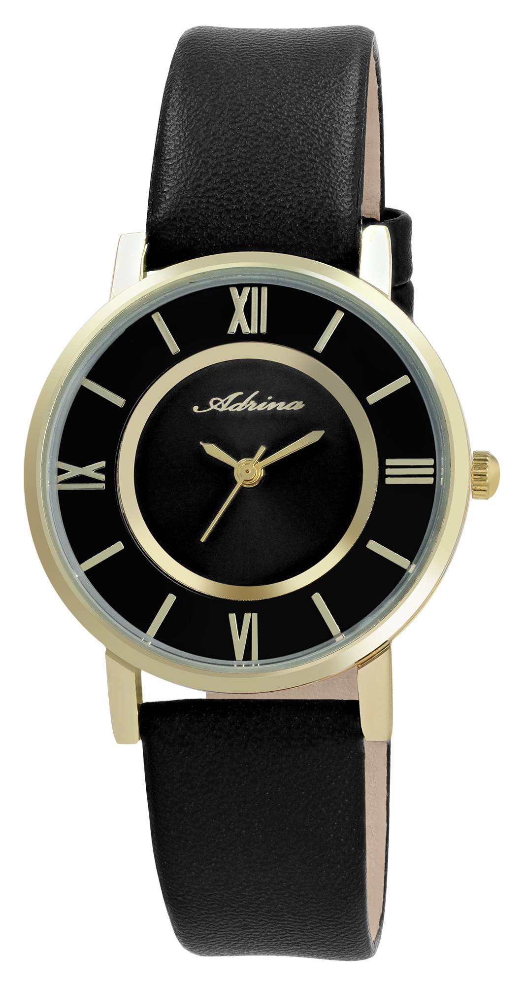 Het analoge 3-hands damespolshorloge van het merk Adrina heeft een hoogwaardig quartz uurwerk. De zwarte imitatieleren band is 16 mm breed bij de lug en kan worden geopend en gesloten met een goudkleurige gesp. De totale lengte van het horloge is 23 cm. De goudkleurige metalen kast met mineraalglas heeft een diameter van 32 mm en een kasthoogte van 9 mm. De achterkant van de kast is gemaakt van roestvrij staal. Een visueel hoogtepunt is het samenspel van de wijzerplaat en de band, die in dezelfde kleur glanzen en het horloge tot een allround succesvol accessoire maken voor dagelijks gebruik en speciale gelegenheden. De wijzerplaat heeft goudkleurige uurmarkeringen op de buitenste ring en Romeinse cijfers op drie, zes, negen en twaalf uur, wat het horloge een klassieke uitstraling geeft.