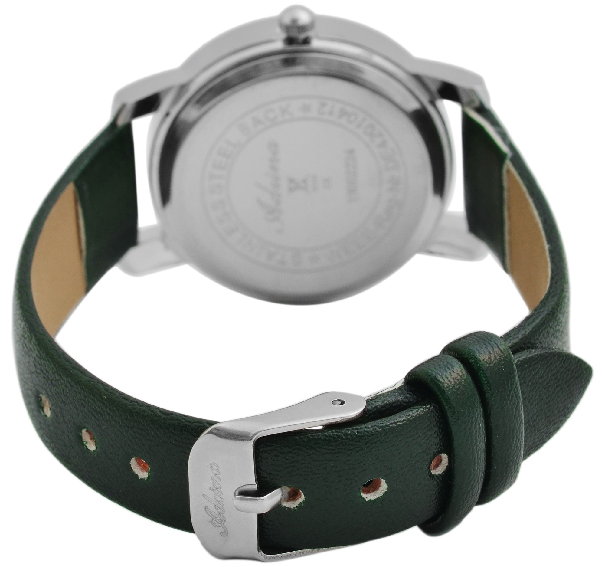 Het analoge 3-hands damespolshorloge van het merk Adrina heeft een hoogwaardig quartz uurwerk. De groene imitatieleren band is 14 mm breed bij de lug en kan worden geopend en gesloten met een zilverkleurige gesp. De totale lengte van het horloge is 21 cm. De zilverkleurige metalen kast met mineraalglas heeft een diameter van 29 mm en een kasthoogte van 8 mm. De achterkant van de kast is gemaakt van roestvrij staal. Het kleurcontrast tussen de lichtgekleurde wijzerplaat en de zwarte wijzers en indexen maakt het gemakkelijk om in één oogopslag de tijd te zien. Met zijn klassieke en eenvoudige ontwerp heb je een horloge voor elke gelegenheid dat ook ideaal is als cadeau.