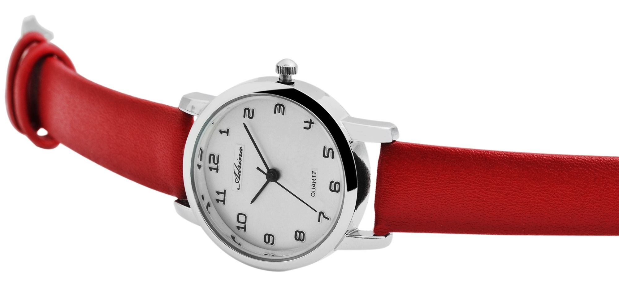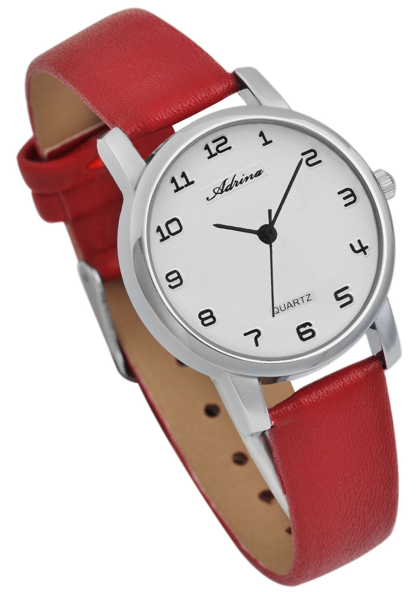 Het analoge 3-hands damespolshorloge van het merk Adrina heeft een hoogwaardig quartz uurwerk. De rode imitatieleren band is 14 mm breed bij de lug en kan worden geopend en gesloten met een zilverkleurige gesp. De totale lengte van het horloge is 21 cm. De zilverkleurige metalen kast met mineraalglas heeft een diameter van 29 mm en een kasthoogte van 8 mm. De achterkant van de kast is gemaakt van roestvrij staal. Het kleurcontrast tussen de lichtgekleurde wijzerplaat en de zwarte wijzers en indexen maakt het gemakkelijk om in één oogopslag de tijd te zien. Met zijn klassieke en eenvoudige ontwerp heb je een horloge voor elke gelegenheid dat ook ideaal is als cadeau.