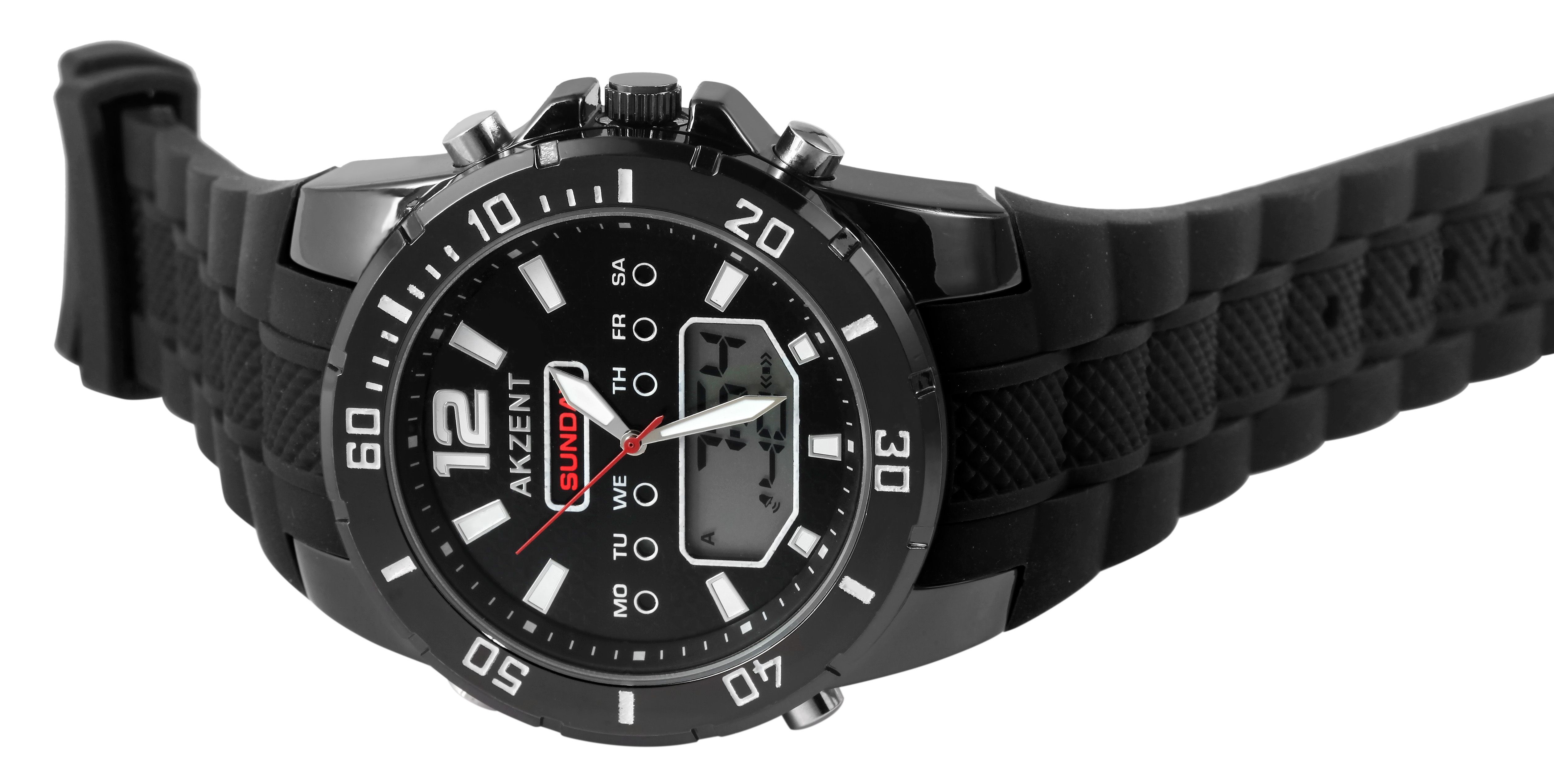 Die analog-digitale Herrenarmbanduhr der Marke Akzent verfügt über ein hochwertiges 3-Zeiger Quarzuhrwerk und über ein hochwertiges Digitaluhrwerk. Das schwarze Silikonarmband ist am Anstoß 22 mm breit und lässt sich mit einer schwarzen Edelstahldornschließe öffnen und schließen. Die Gesamtlänge der Uhr beträgt 26,5 cm. Das schwarze Metallgehäuse hat eine Abmessung von 50 mm im Durchmesser und einer Gehäusehöhe von 15 mm. Der Gehäuseboden ist aus Edelstahl gefertigt und die Uhr hat eine Wasserdichtigkeit von 3 bar. Einstellen lässt sich die analoge Uhrzeit über eine Krone, die digitale Uhrzeit über die vier Drücker, die auf zwei, vier, acht und zehn Uhr platziert sind. Über die Drücker lassen sich auch noch alle weiteren Funktionen wie die Stoppfunktion, die Alarmfunktion und die Beleuchtung des Displays bedienen. Dank der Lichtfunktion und der mit Superluminova beschichteten Zeiger und Indexe lässt sich auch im Dunkeln die Uhrzeit besonders gut ablesen. Das schwarze Zifferblatt ist ausgestattet mit einem Digitalfeld, bei dem sich die Ansicht je nach eingestelltem Modus ändert. Ein weiteres Highlight der Herrenuhr ist der rot hervorgehobene Sekundenzeiger und die rote Wochentagsanzeige. Die analog-digitale Herrenarmbanduhr ist ein sportlicher und zuverlässiger Begleiter, der dank der vielen Funktionen vielseitig nutzbar und zudem noch ein absoluter Blickfang an Ihrem Handgelenk ist.