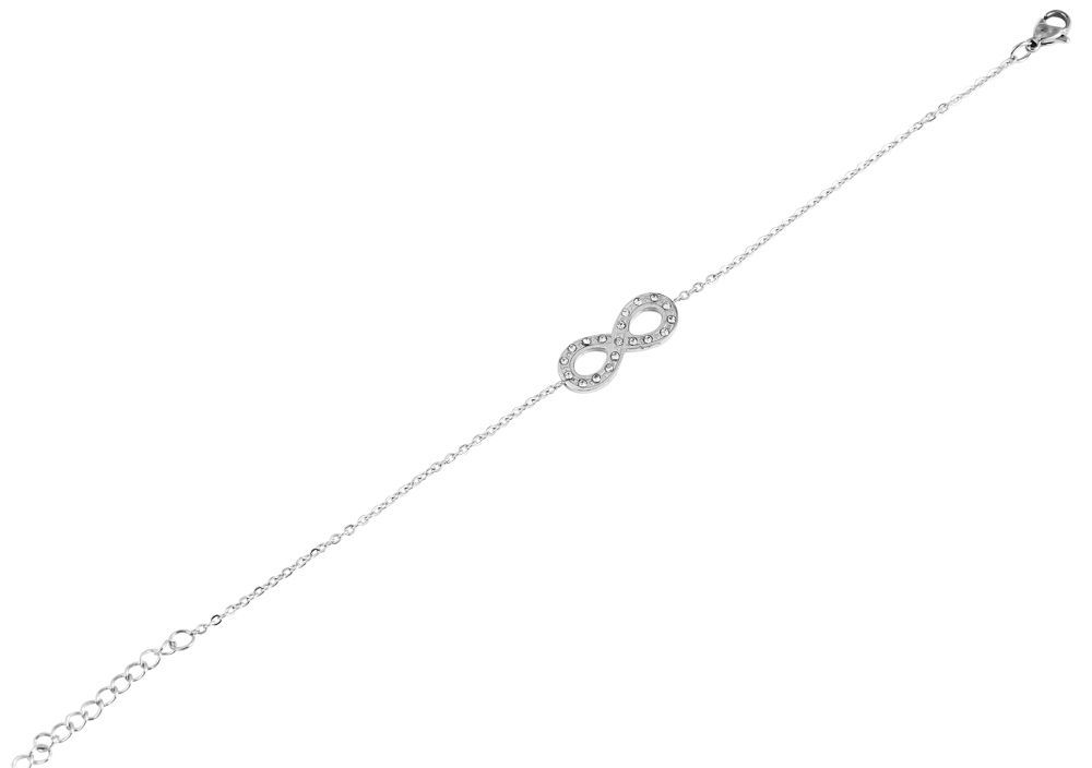 De sieradenarmband van het merk Akzent is gemaakt van roestvrij staal in een ankerpatroon. De armband wordt in het midden onderbroken door een glanzend, simili-gezet oneindigheidssymbool, waardoor het een absolute blikvanger is. De armband kan worden geopend en gesloten met een karabijnsluiting, die ook van roestvrij staal is gemaakt. Hij heeft een lengte van 18 cm en een kettingdikte van 1 mm. Bovendien is aan één uiteinde van de armband een verlengkettinkje van 3 cm bevestigd om de lengte met maximaal 3 cm te variëren en hem aan elke pols aan te passen. Dit product wordt geleverd op een witte juwelenkaart. De afmetingen zijn 25 x 210 mm en ideaal om te presenteren in een geschikte display of om cadeau te geven.