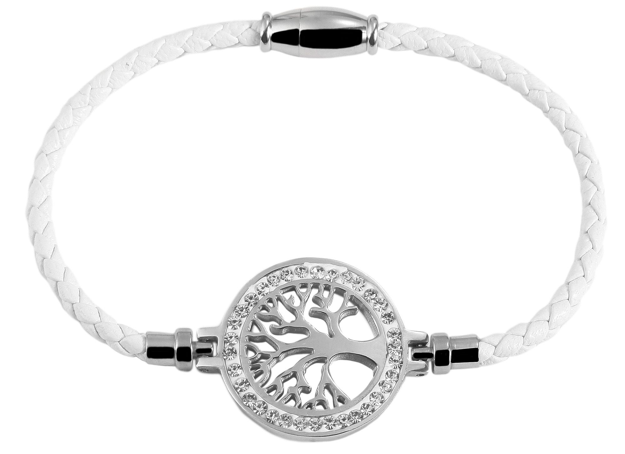Productinformatie "Accentarmband van imitatieleer, gevlochten met roestvrij stalen element levensboom, wit/zilverkleurig"