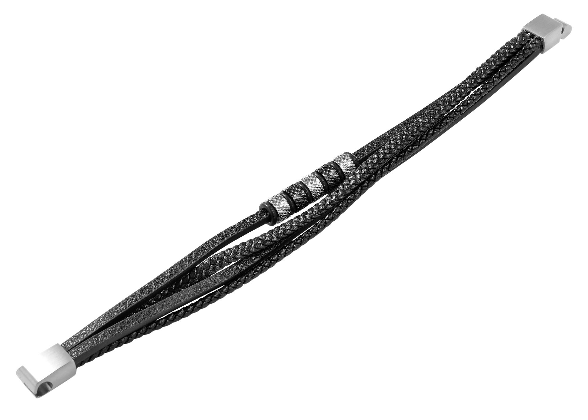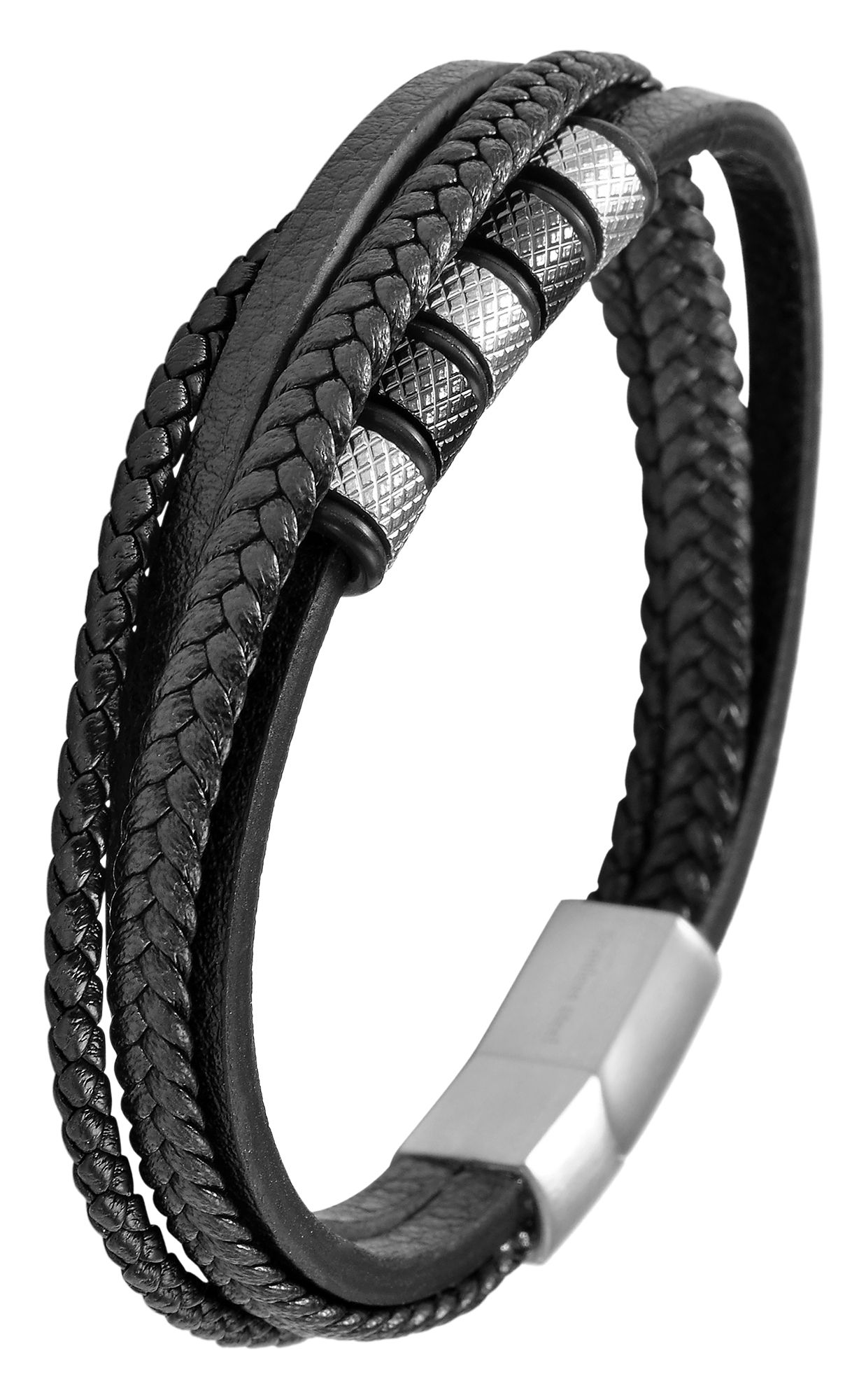 Deze zwarte armband van het merk Akzent is gemaakt van imitatieleer en is 19 cm lang. De vierrijige armband bestaat uit een gevlochten band van imitatieleer, een gevlochten koord en twee gladde banden. Eén band is voorzien van glanzende, gestructureerde roestvrijstalen elementen en rubberen ringen, die het ontwerp van de armband vakkundig afmaken. De armband kan gemakkelijk worden geopend en gesloten met een praktische en stevige magneetsluiting en kan ook worden gepersonaliseerd met kleine gravures. Kunstleer en roestvrij staal maken dit accessoire bijzonder modern en het slaat een mooi figuur om zowel mannelijke als vrouwelijke polsen. Deze armband is het perfecte accessoire om je outfit compleet te maken en is bijzonder huidvriendelijk dankzij de hoogwaardige grondstoffen.