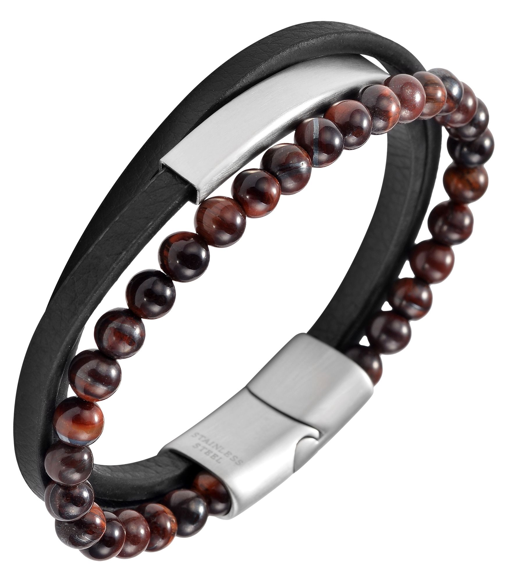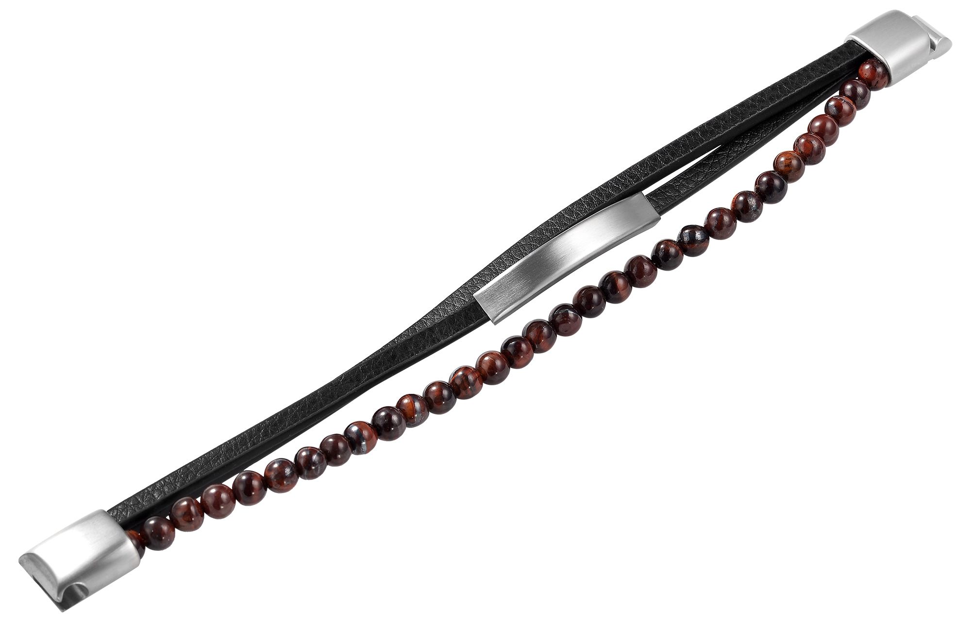 Deze zwarte armband van het merk Akzent is gemaakt van imitatieleer en natuurstenen kralen en is 19 cm lang. De drie-rijige armband bestaat uit een streng tijgeroog kralen en twee imitatieleren bandjes. Door de natuurlijke aard van de minerale kwarts is elke kraal uniek en heeft daarom verschillende kleureffecten. Eén band is voorzien van een mat afgewerkt identiek plaatje van 41 x 7 mm, dat ideaal is om te graveren. De armband kan gemakkelijk worden geopend en gesloten met een praktische en stevige magneetsluiting en kan ook worden aangepast met kleine gravures. Door de combinatie van verschillende materialen ziet dit accessoire er bijzonder uit en het slaat een mooi figuur om zowel mannelijke als vrouwelijke polsen. Deze armband is het perfecte accessoire om je geliefden een origineel sieraad te geven of om jezelf te verwennen.