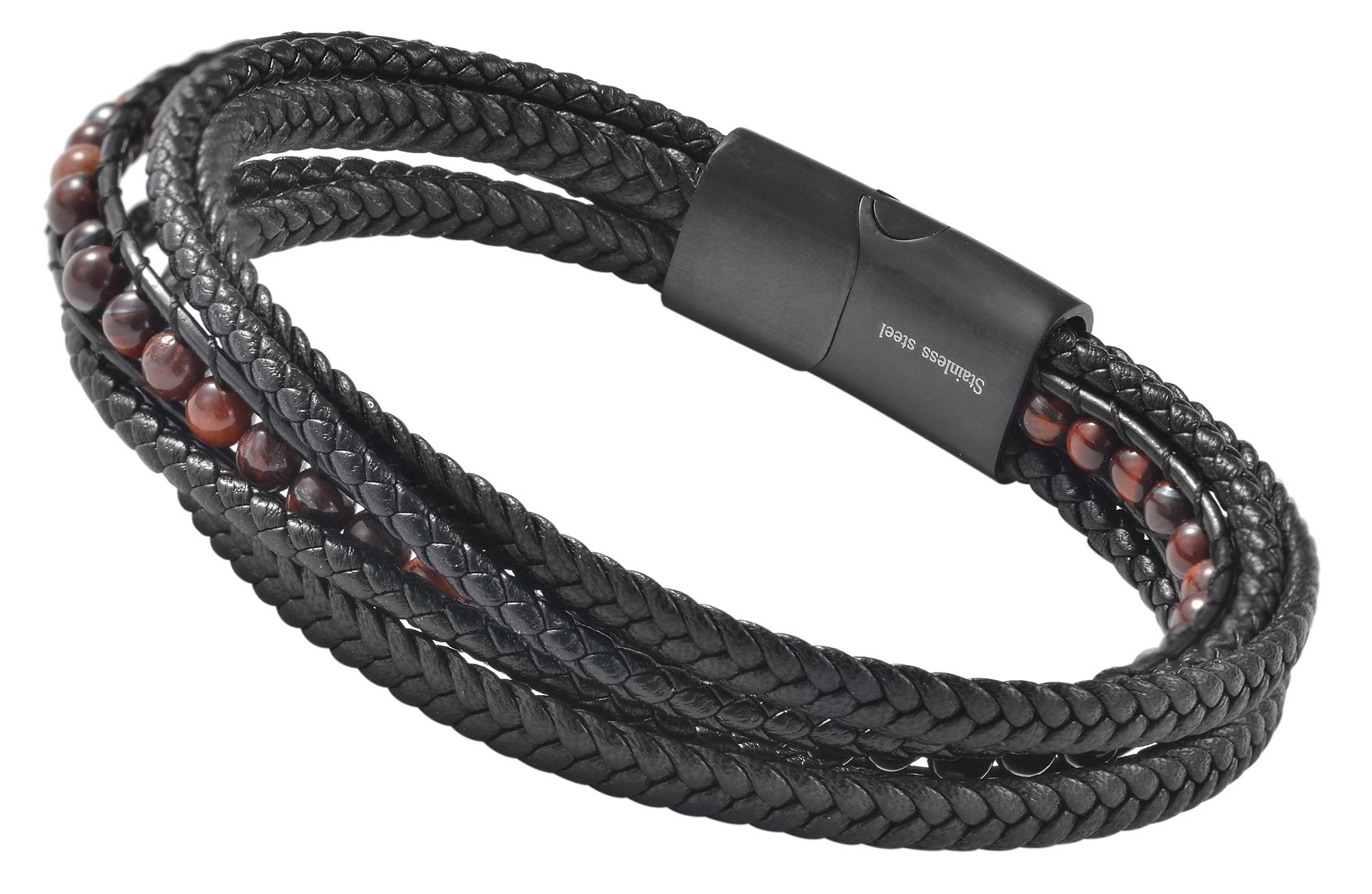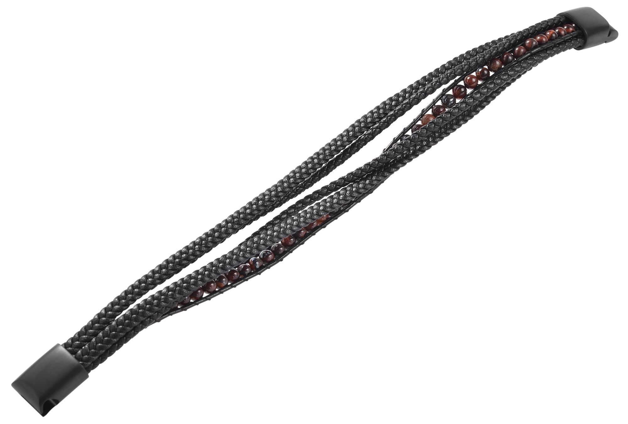 Deze zwarte armband van het merk Akzent is gemaakt van imitatieleer en natuurstenen kralen en is 23 cm lang. De vijfrijige sieradenarmband bestaat uit twee gevlochten imitatieleren bandjes en koordjes en een streng bruine tijgeroogkralen. Door de natuurlijke eigenschappen van het mineraal kwarts is elke kraal uniek en heeft daardoor verschillende kleureffecten. Het kan gemakkelijk worden geopend en gesloten met een praktische en stevige magnetische sluiting en kan ook worden gepersonaliseerd met kleine gravures. De mat afgewerkte sluiting is gemaakt van roestvrij staal en afgewerkt met een hoogwaardige ion-plating. Dit product is het perfecte accessoire om je dierbaren een origineel sieraad te geven of om jezelf te verwennen.