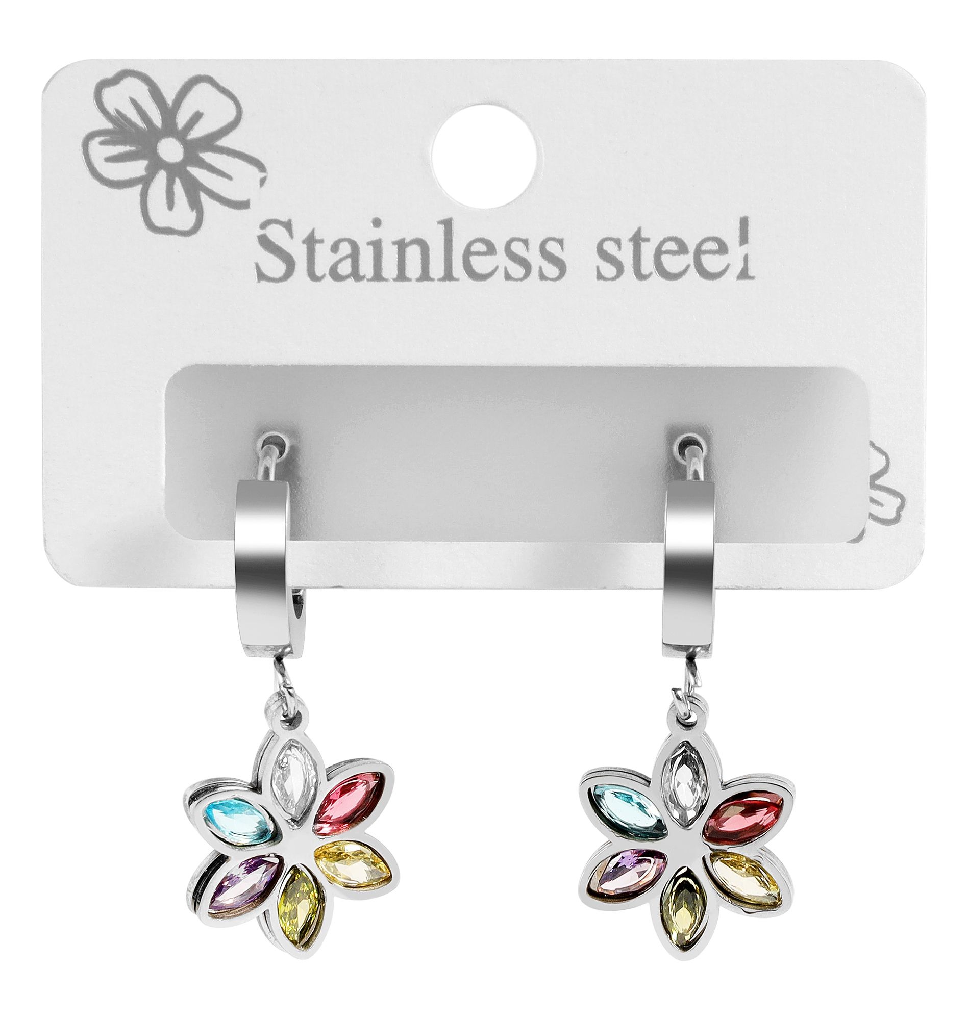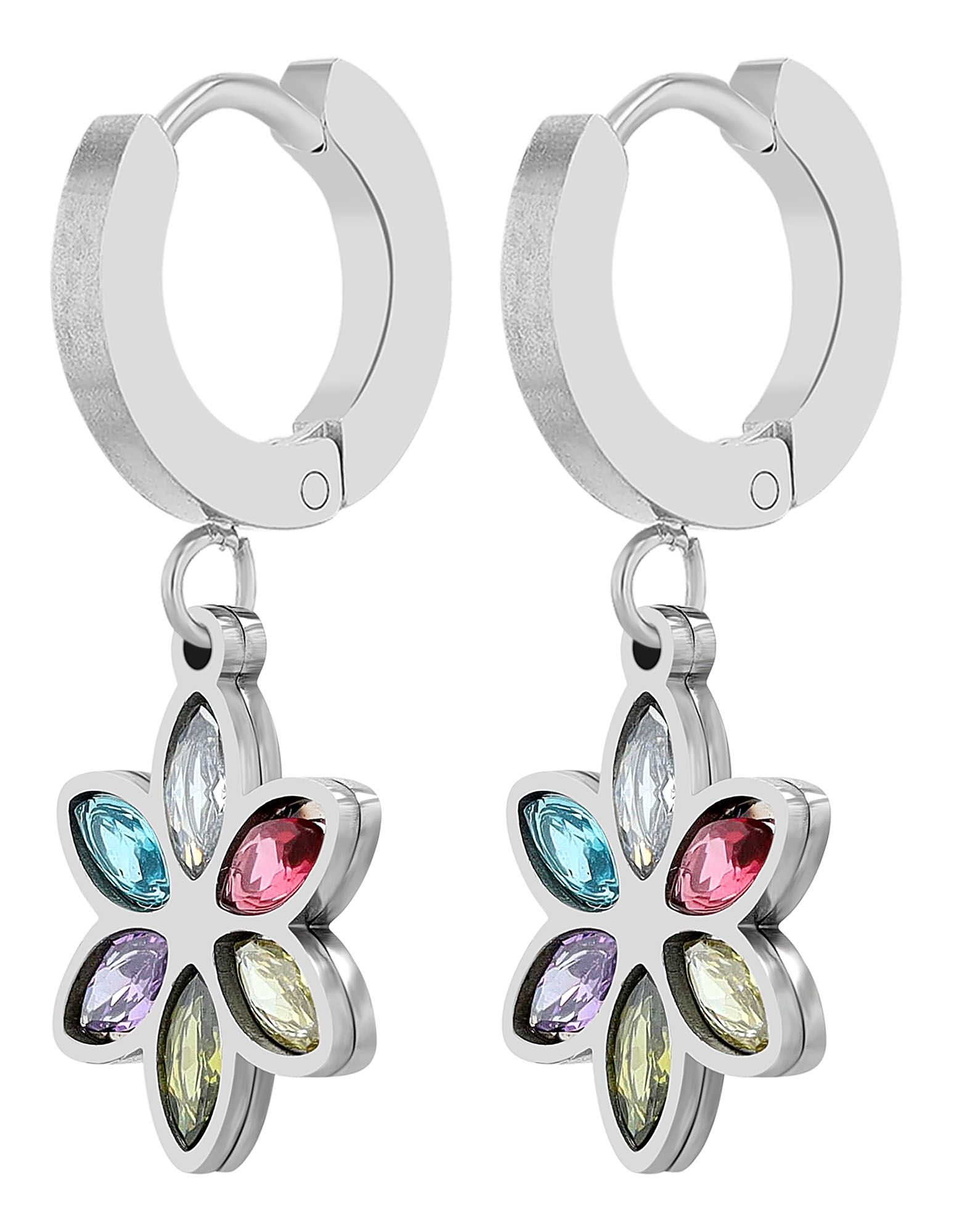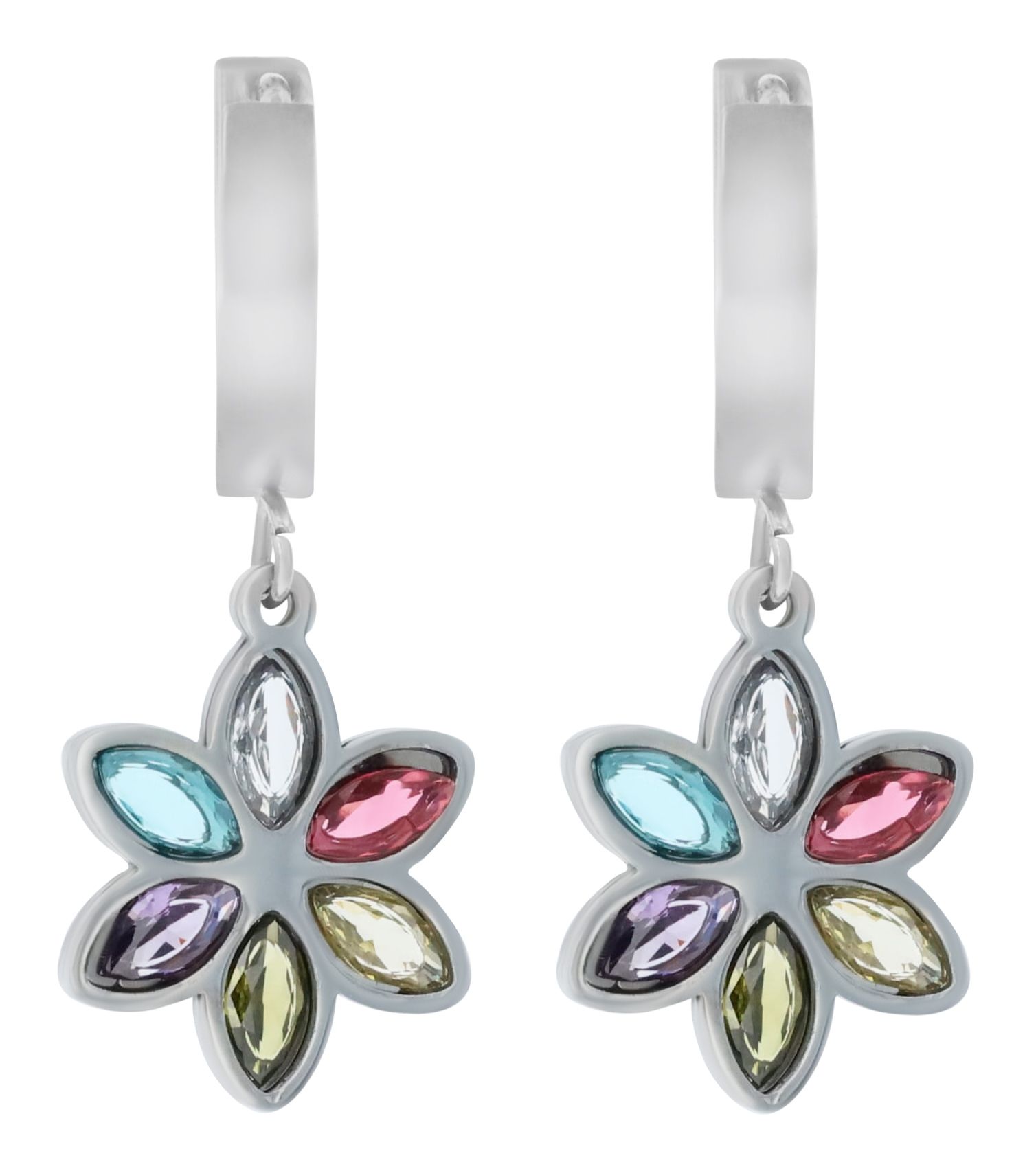 Productinformatie "Akzent Creolen mit Blumenanhänger, mehrfarbiger Besatz, Edelstahl, silberfarben"