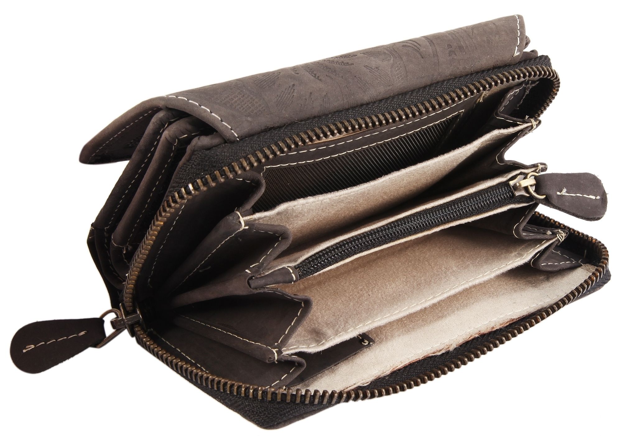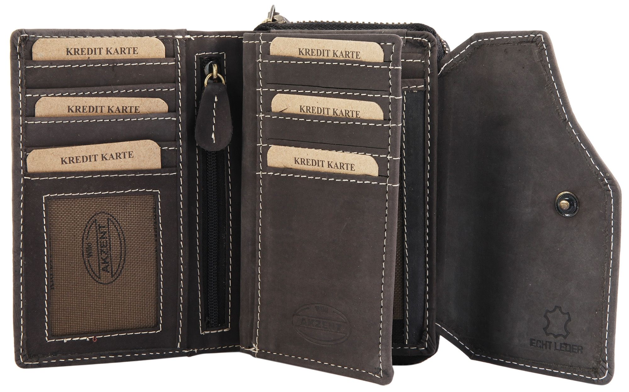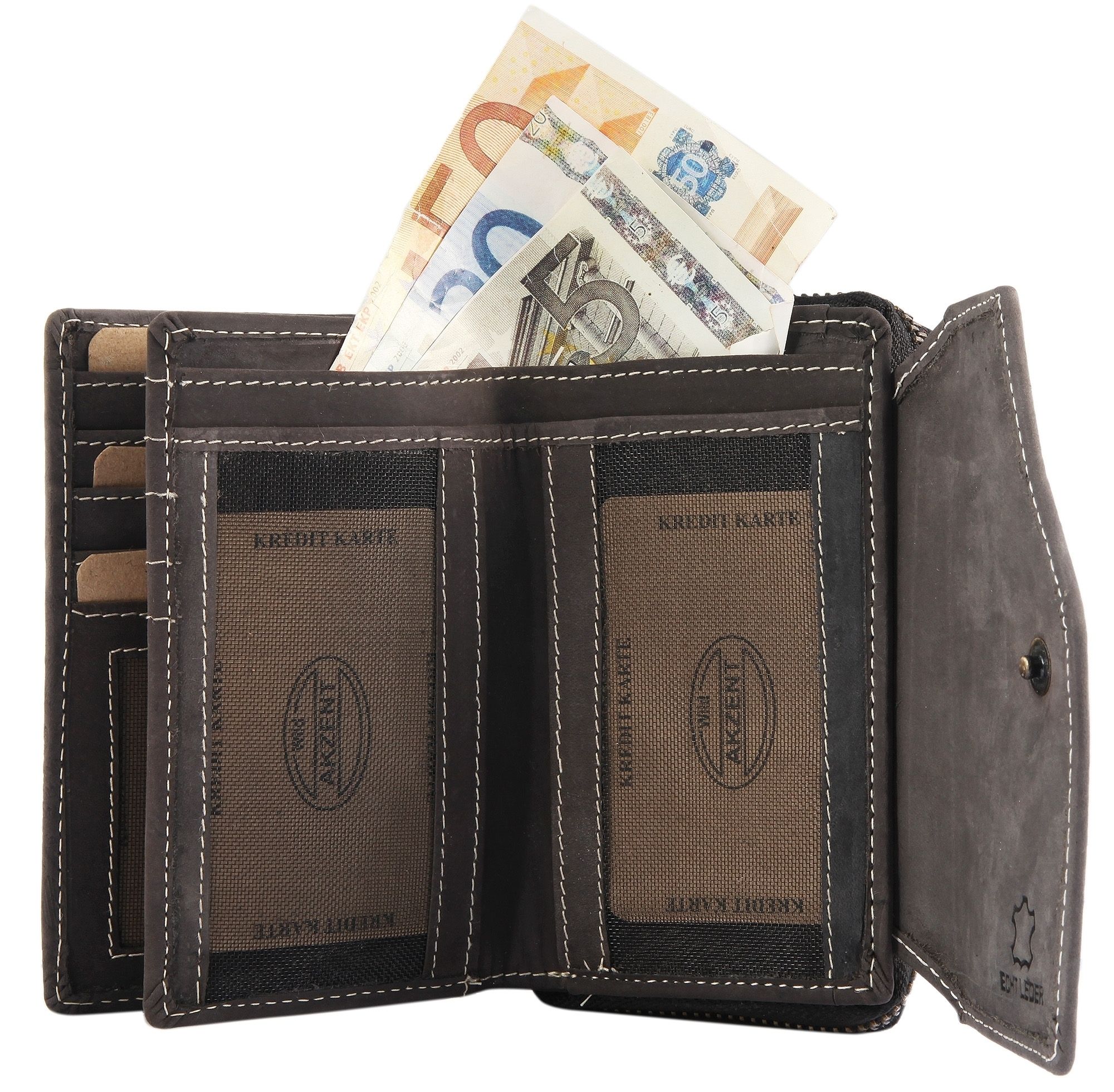 De zwarte damesportemonnee in liggend formaat van het merk Akzent is gemaakt van echt rundsuède en voorzien van een moderne bloemenprint. De binnenvoering is ook grotendeels van leer, met een textielgedeelte. De witte stiksels aan de buiten- en binnenkant van de portemonnee zorgen voor een goede duurzaamheid en stabiliteit. De portemonnee is niet alleen een visuele blikvanger, maar ook een echt ruimtewonder en biedt veel opbergruimte voor alle belangrijke documenten. De portemonnee is onderverdeeld in 10 creditcardvakken, 2 biljetvakken, 4 muntvakken met boodschappenchip, 1 muntvak met ritssluiting, 1 ritsvak aan de binnenkant, 3 insteekvakken en 2 transparante ID-kaartvakken. De portemonnee wordt gesloten met een praktische drukknoopsluiting aan de buitenkant en een ritssluiting op het kleine kleingeldvak. De ongevulde maat is 9 cm lang, 14,1 cm breed en 4,9 cm dik.
