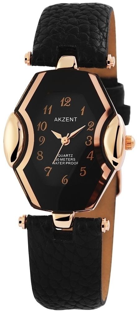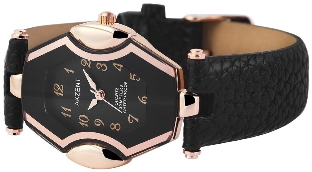 Het Akzent analoge dameshorloge heeft een hoogwaardig quartz uurwerk. De imitatieleren band is 18 mm breed en opent met een gesp. De totale lengte is 22 cm. De metalen kast met mineraalglas meet 30 x 34 mm en is 9 mm hoog. De kastdeksel is gemaakt van roestvrij staal. Het horloge is getest op een druk van 3 ATM.