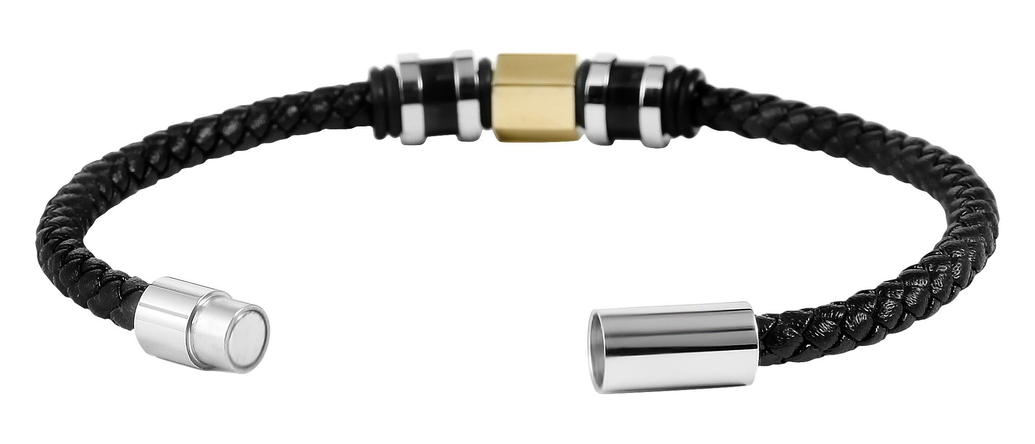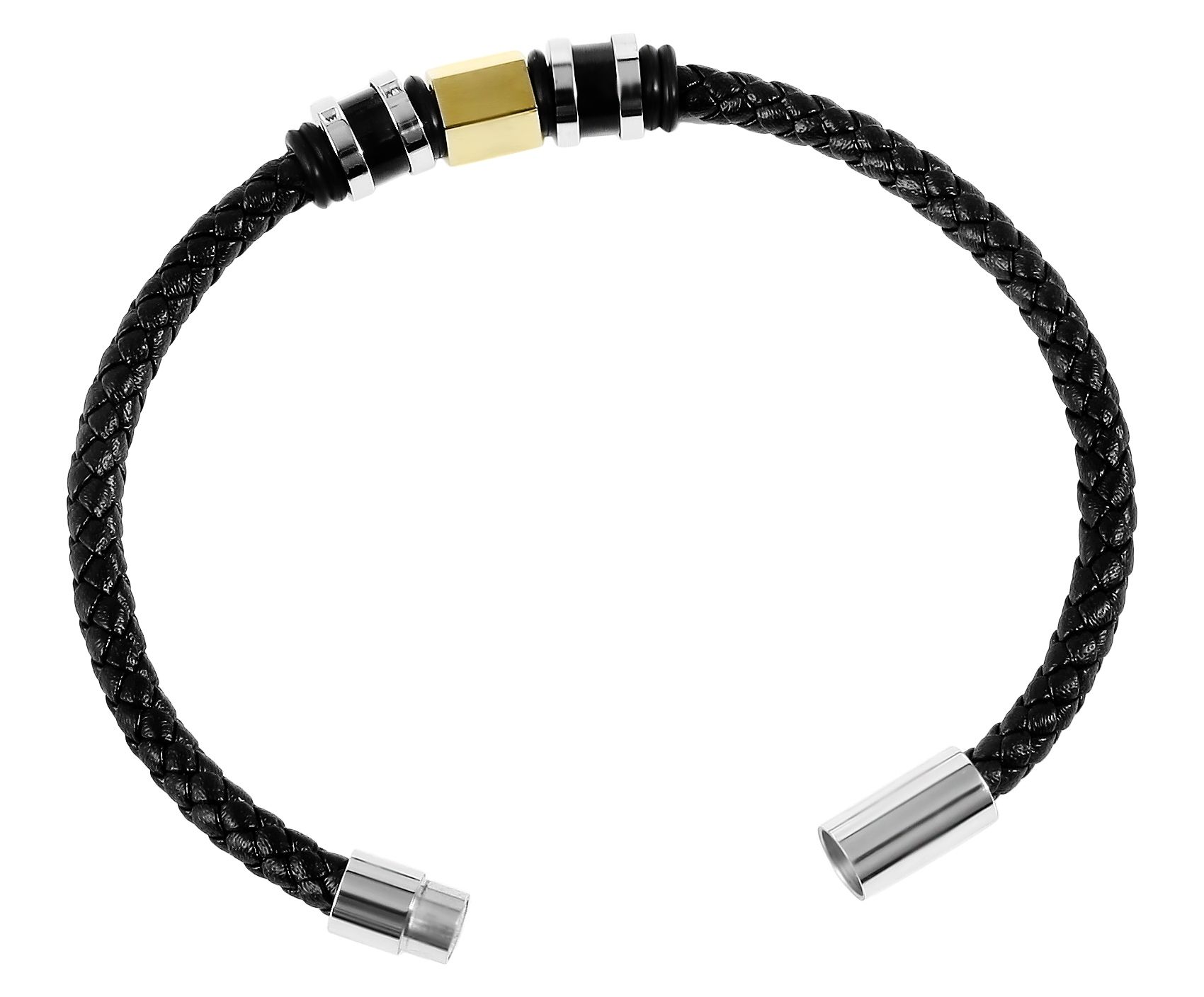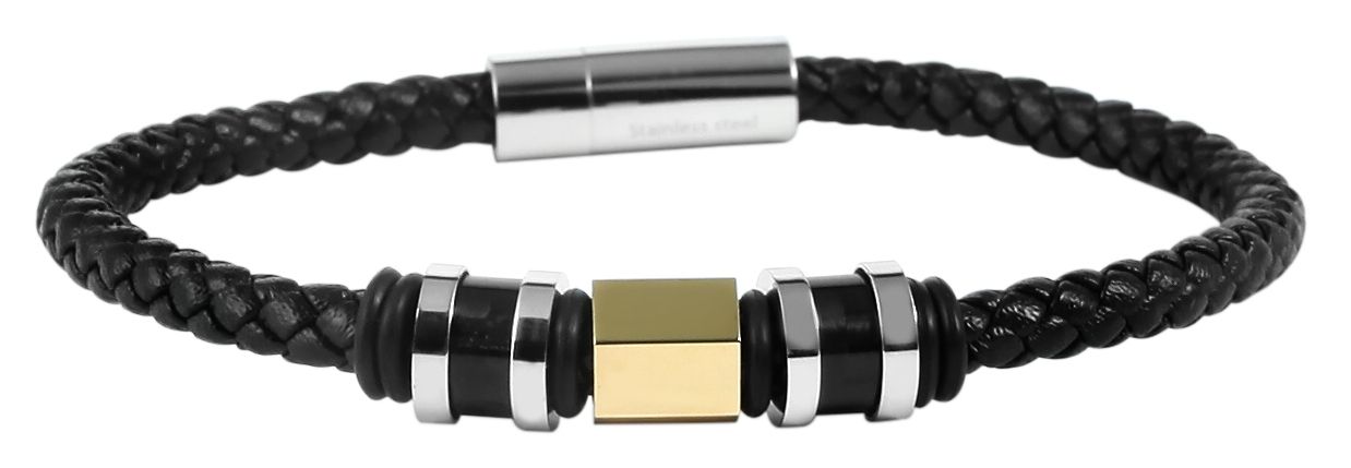 De Akzent armband is gemaakt van echt leer en heeft een totale lengte van 21,5 cm. De leren armband bestaat uit een 5 mm breed gevlochten leren koord, dat in het midden is versierd met roestvrijstalen, carbon elementen en rubberen ringen. Deze elementen vallen goed op en ronden het ontwerp van de armband af. De armband kan gemakkelijk worden geopend en gesloten met een praktische magneetsluiting en kan ook worden gepersonaliseerd met kleine gravures. Leer en roestvrij staal maken dit accessoire bijzonder modern en het slaat een mooi figuur om zowel mannelijke als vrouwelijke polsen. Deze armband is het perfecte accessoire om je outfit compleet te maken en is bijzonder huidvriendelijk dankzij de natuurlijke en hoogwaardige grondstoffen.