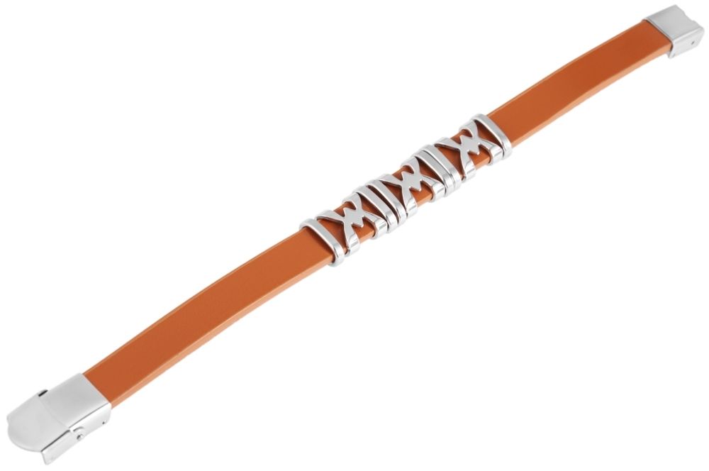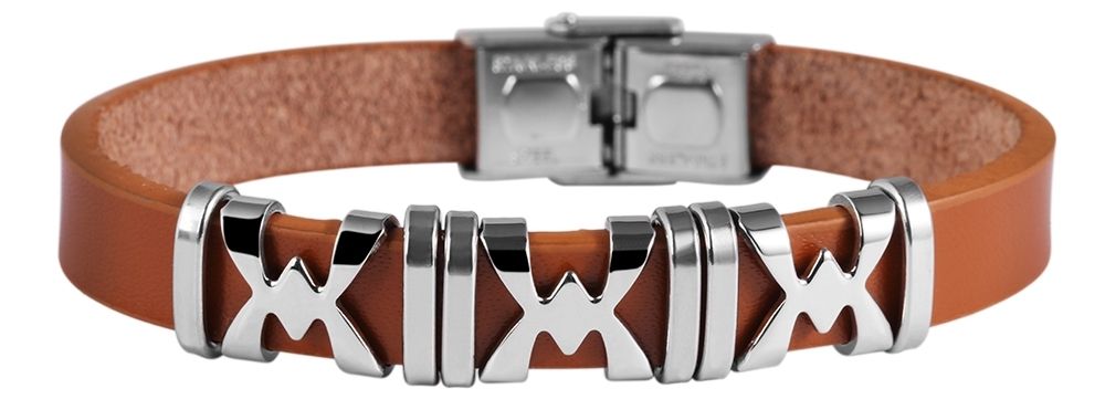 De echt lederen armband van het merk Akzent is gemaakt van een 1,3 cm brede band van echt leer. Het is ook versierd met drie identieke zilverkleurige roestvrijstalen elementen die een X-vorm vormen. Hij kan worden geopend en gesloten met een zilverkleurige haaksluiting, die ook van roestvrij staal is gemaakt. De totale lengte is 22 cm en de dikte is 7 mm.