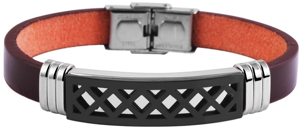 De echt leren armband van het merk Akzent is gemaakt van een eenvoudige leren band. Deze heeft een roestvrijstalen element in het midden. Dit is zilverkleurig en is bedekt met een ander zwart roestvrijstalen element. Het heeft een geruit patroon en maakt van de armband iets heel bijzonders. Er zijn ook 3 smalle roestvrijstalen oogjes rechts en links van het stalen element, die de algehele look van de moderne sieradenarmband compleet maken. De armband kan worden geopend en gesloten met een zilverkleurige haaksluiting, die ook van roestvrij staal is gemaakt. Een bijzondere armband die elke outfit bijzonder maakt.