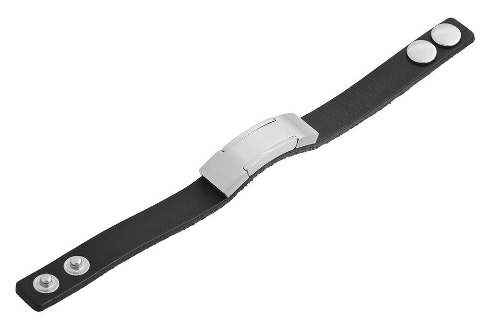 De zwarte echt lederen armband van het merk Akzent is gemaakt van een 1,5 cm brede lederen band. Het is versierd met een zilverkleurig roestvrijstalen element in het midden. Dit heeft twee smalle contrasterende elementen aan de buitenranden, die de armband een beetje breken. De totale lengte van de moderne sieradenarmband is 22 cm en hij is 8 mm dik. Hij kan worden geopend en gesloten met twee zilverkleurige drukknopen, waarmee ook de breedte van de armband kan worden aangepast. Het roestvrijstalen element is geschikt om te graveren. Een gepersonaliseerde armband is een geweldig cadeau.