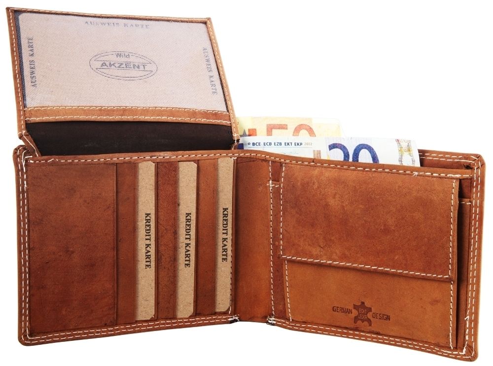 De lichtbruine portemonnee van het merk Akzent is gemaakt van echt leer in liggend formaat. Hij bestaat uit twee biljetvakken, een muntvak en een uitbreidbaar kaartvak. De biljetvakken bevinden zich aan de achterkant, het muntvak aan de rechterkant. Deze heeft ook een ingenaaid vakje voor een winkelwagenmuntje. Er zitten zes kaartvakjes aan de linkerkant van de portemonnee, die vanaf de rechterkant toegankelijk zijn. Achter de kaartsleuven zit een praktisch insteekvak. De leren portemonnee met kaartsleuven en insteekvak kan naar boven worden geopend. Aan de achterkant zit een groot vak voor ID-kaarten. Direct daaronder zitten nog eens zes kaartvakjes. Er zitten ook twee grote vakken onder en onder het muntvak. De afmetingen komen voort uit een lengte van 10,2 cm, een breedte van 12,5 cm en een hoogte van 2,5 cm.