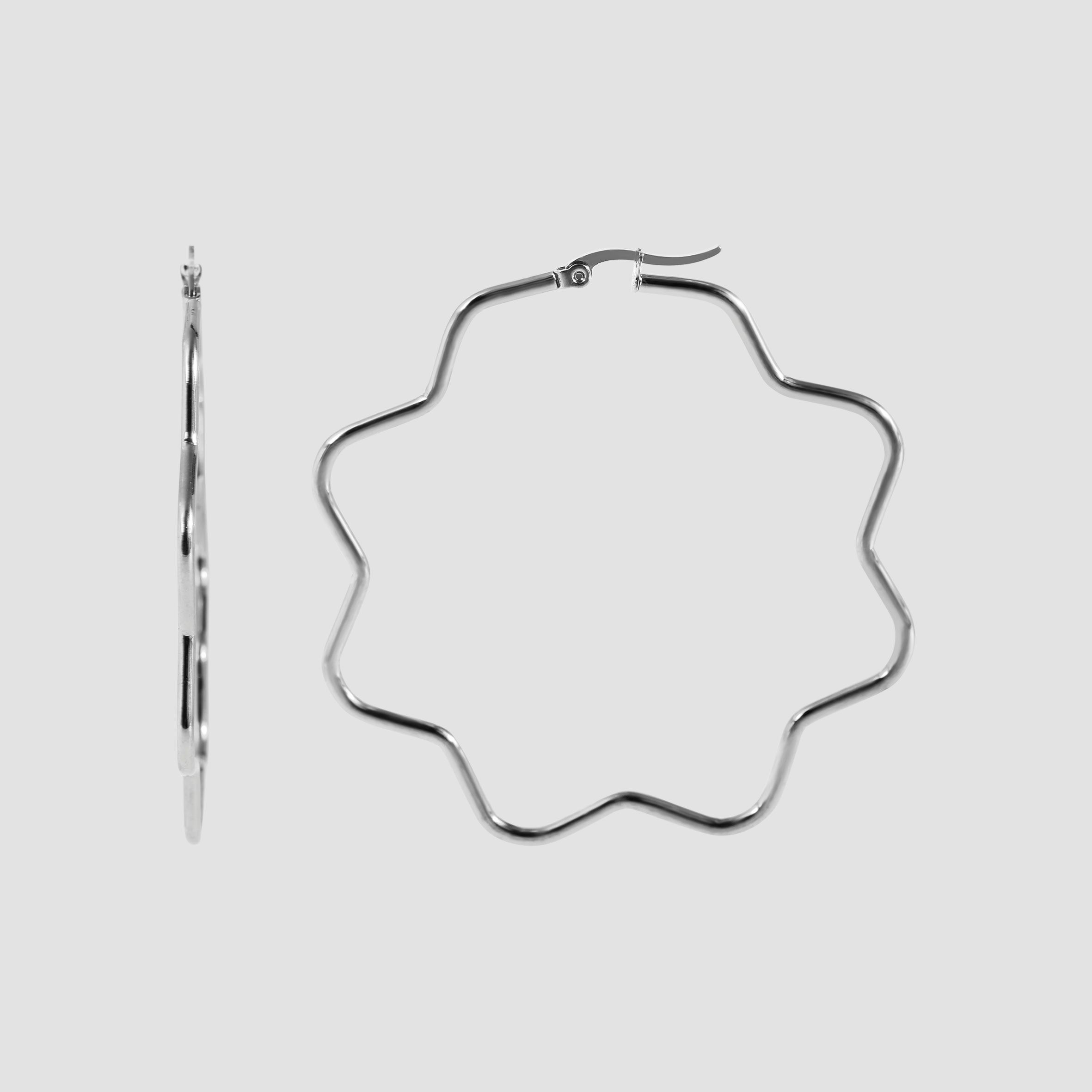 De zilverkleurige hoepeloorbellen van het merk Akzent zijn gemaakt van roestvrij staal en hebben de vorm van een bloem. Ze zijn bovendien hoogglans gepolijst en kunnen worden geopend en gesloten met een clipsluiting. De hoepeloorbellen zijn 65 mm lang, 2 mm breed en 2 mm dik.