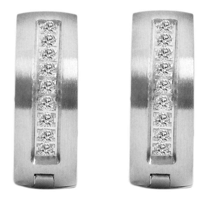 De scharnierende oorbellen met accent zijn gemaakt van roestvrij staal en zijn bezet met 9 fonkelende similisteenjes per oorbel. Het oppervlak is geborsteld, wat deze oorbellen bijzonder modieus maakt. De oorbellen zijn gemakkelijk te openen en te sluiten dankzij de gespsluiting. Het artikel heeft de volgende afmetingen: Diameter: 9 mm, breedte 5 mm en dikte 2 mm.