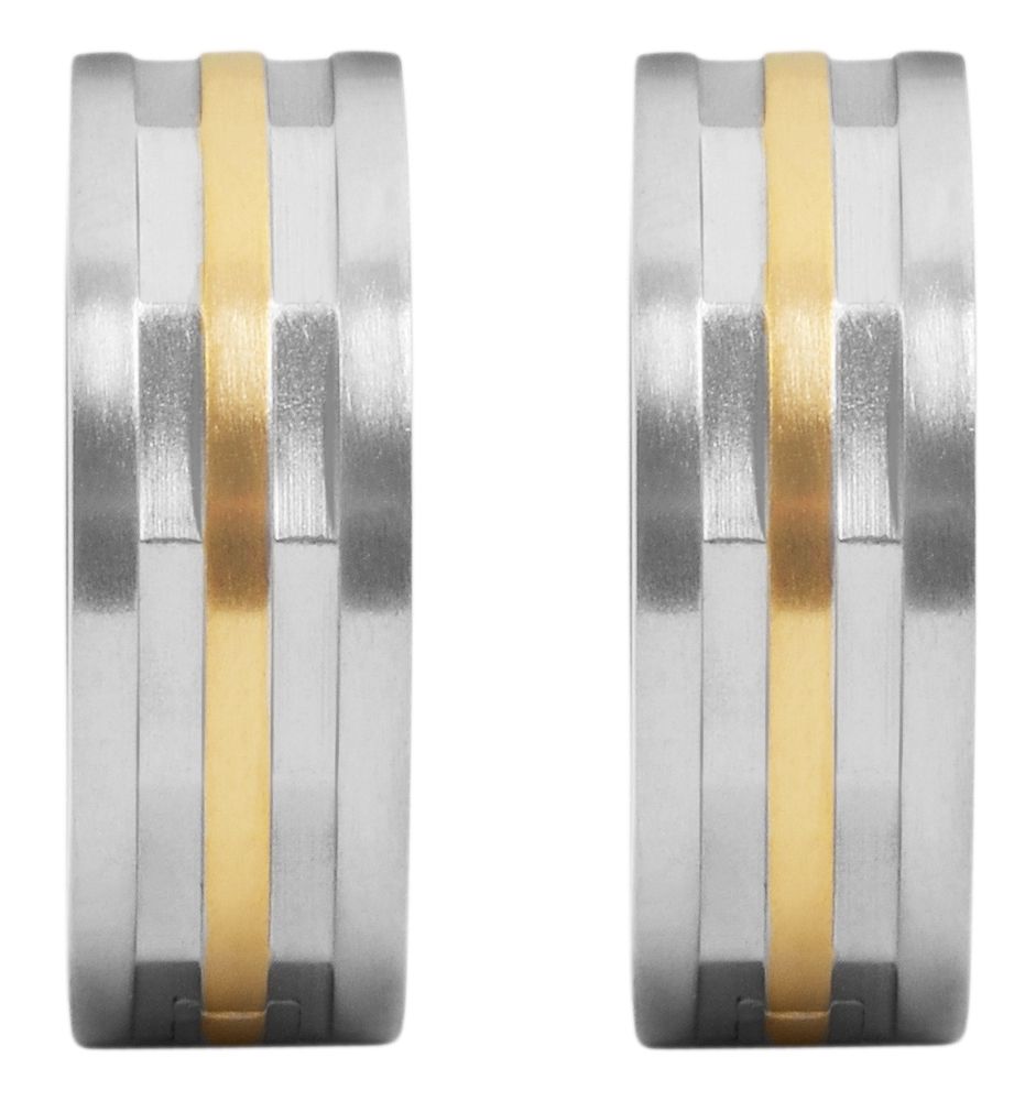 De scharnierende oorbellen met accent zijn gemaakt van roestvrij staal en hebben een tweekleurige kleur (zilver/goud). Het matte oppervlak heeft kleine inkepingen. De oorbellen kunnen gemakkelijk worden geopend en gesloten met de scharniersluiting. Het artikel heeft de volgende afmetingen: Diameter: 16 mm, breedte 7 mm en dikte 2 mm.