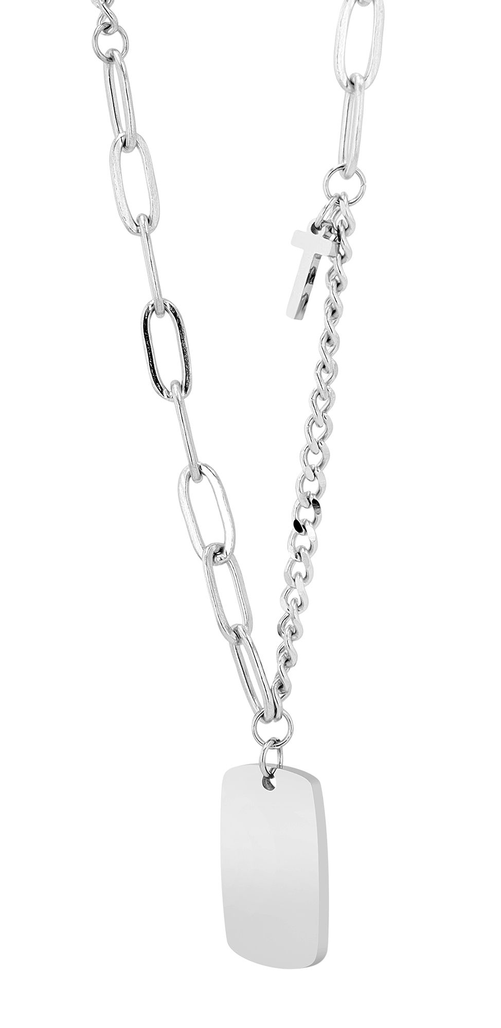 De "Tariq" accentketting met graveerbare hanger is een verfijnd sieraad dat een aantrekkelijk ontwerp combineert met hoogwaardig roestvrij staal. Het gebruik van roestvrij staal garandeert niet alleen een aantrekkelijke esthetiek, maar ook robuustheid en duurzaamheid. Roestvrij staal staat bekend om zijn corrosiebestendigheid en onderhoudsgemak, waardoor de ketting zelfs na langdurig dragen zijn glans behoudt. Het collier, met een totale lengte van 45 cm en de optie om het met nog eens 5 cm te verlengen, bestaat uit twee verschillende soorten kettingen en een discrete kruis hanger, die het een modern tintje geven. De karabijnsluiting zorgt niet alleen voor een goede pasvorm, maar maakt het ook gemakkelijk om om te doen en af te doen. De blikvanger van deze ketting is de 18,5 x 11,5 x 1,5 mm graveerbare hanger. Deze hanger kan worden gegraveerd, waardoor dit sieraad een persoonlijk en uniek accessoire wordt.
