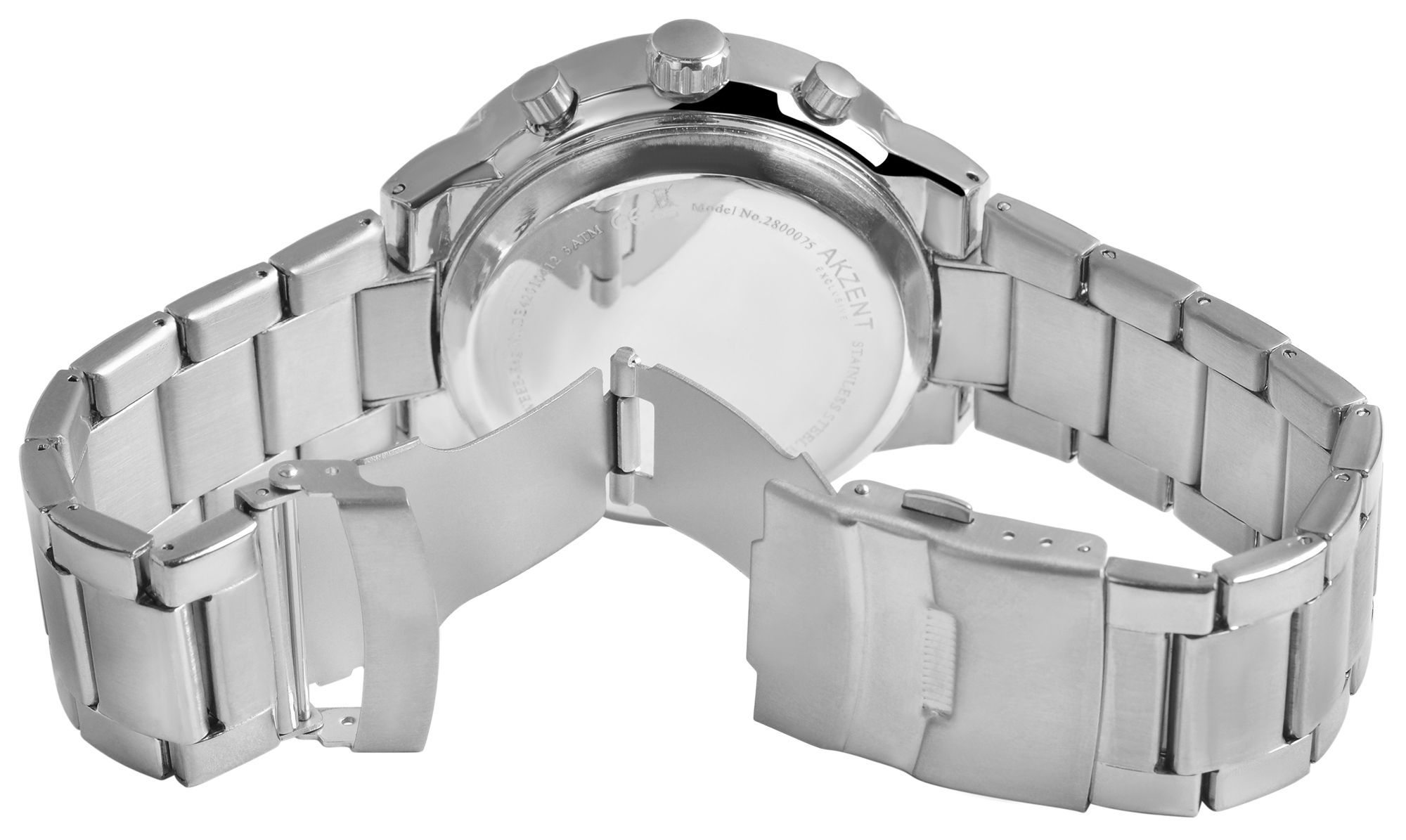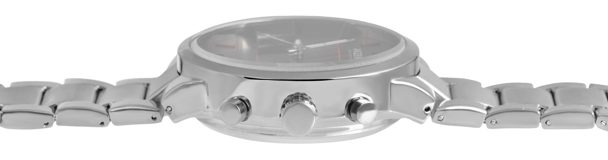Het analoge herenpolshorloge met 3 wijzers van het merk Akzent Exclusive heeft een hoogwaardig kwartsuurwerk en een klein digitaal uurwerk. De zilverkleurige roestvrijstalen armband is 24 mm breed bij de lug en kan worden geopend en gesloten met een zilverkleurige roestvrijstalen vouwsluiting. De totale lengte van het horloge is 23 cm. De zilverkleurige metalen kast met mineraalglas heeft een diameter van 46 mm en een kasthoogte van 16 mm. De achterkant van de kast is gemaakt van roestvrij staal en het horloge heeft een waterdichtheid van 3 bar. Een bijzonder kenmerk van dit horloge is dat de tijd twee keer wordt weergegeven op de wijzerplaat. De ene toont de analoge tijd en de andere de digitale tijd in een klein digitaal veld tussen acht en negen uur. Naast de tijd kunnen ook de huidige datum en seconden worden weergegeven in het digitale veld. De wijzerplaat is antracietkleurig en de donkerrode gepolijste streepindexen zorgen voor een mooi accent. De wijzers zijn ook zilverkleurig. De wijzers zijn gecoat met Superluminova, waardoor je de tijd zelfs in het donker gemakkelijk kunt aflezen. Een groot herenhorloge dat op verschillende manieren gecombineerd kan worden.