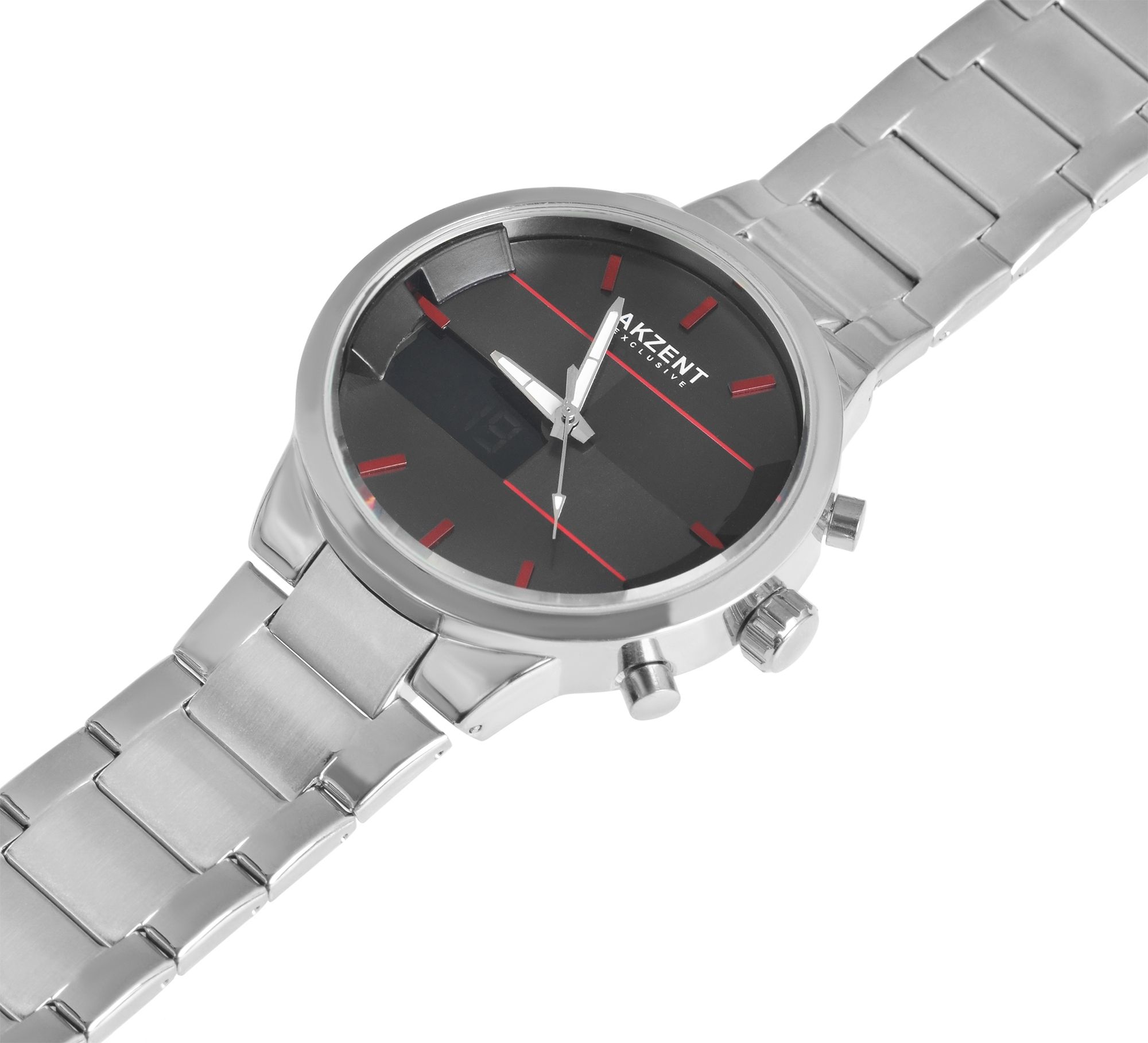 Akzent Exclusief herenhorloge met roestvrijstalen armband, analoog en digitaal, zilverkleurig