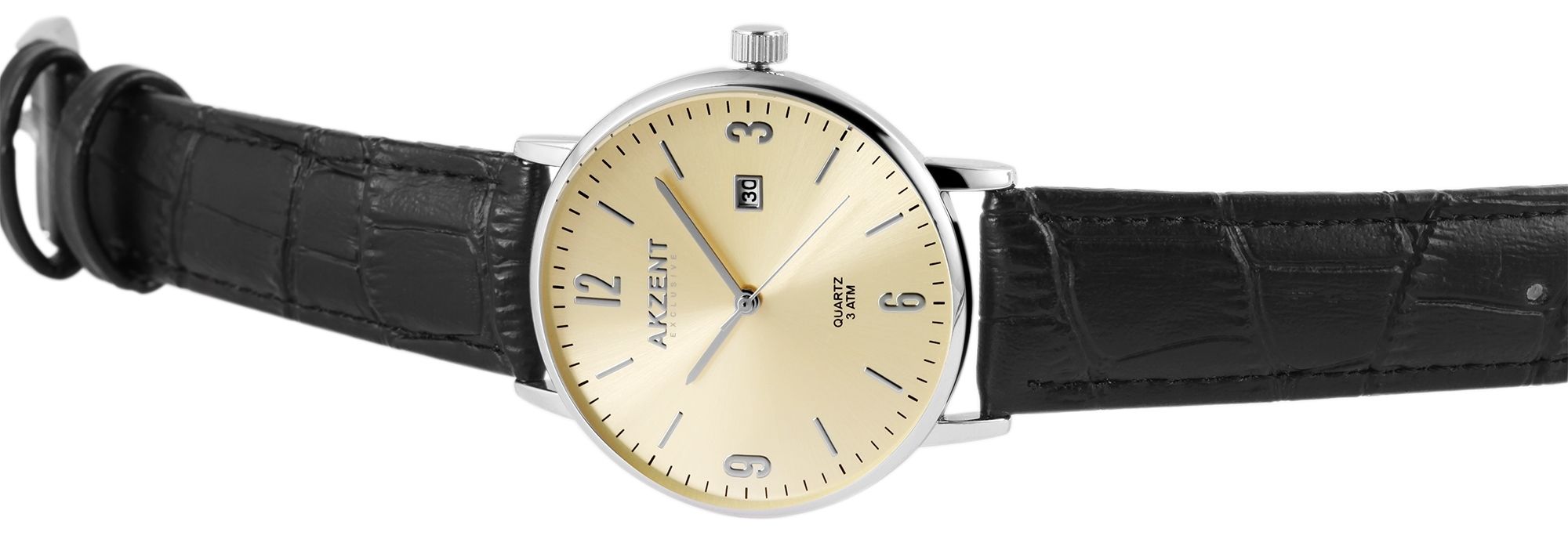 Het analoge herenpolshorloge met 3 wijzers van het merk Akzent Exclusive heeft een hoogwaardig kwartsuurwerk. De zwarte imitatieleren band is 20 mm breed bij de lug en kan worden geopend en gesloten met een zilverkleurige gesp. De totale lengte van het horloge is 25 cm. De zilverkleurige metalen kast met mineraalglas heeft een diameter van 40 mm en een kasthoogte van 10 mm. De achterkant van de kast is van roestvrij staal en het horloge heeft een waterdichtheid van 3 bar. De wijzerplaat is goudkleurig en de wijzers en cijfers zijn zilverkleurig en passen goed bij de algehele look van het horloge. Het horloge maakt indruk met zijn eenvoudige elegantie en kan op verschillende manieren worden gecombineerd.
