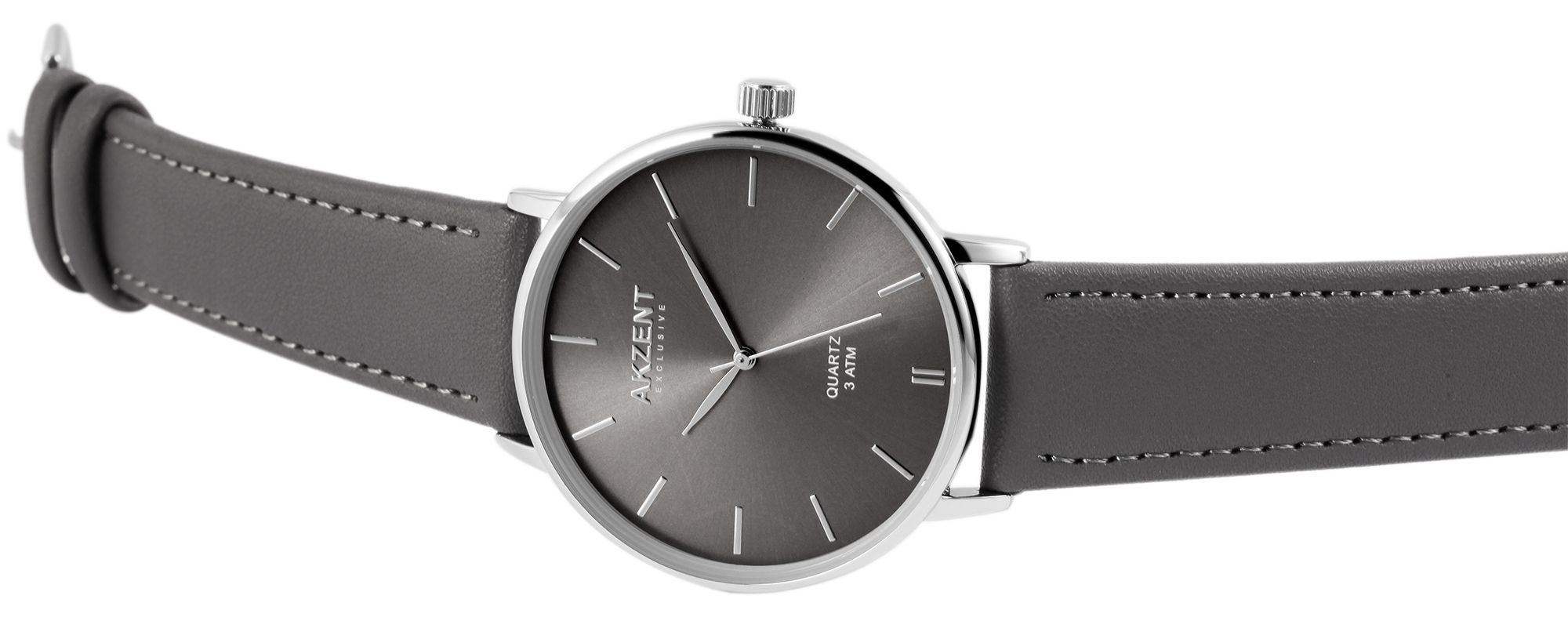 Het analoge herenpolshorloge met 3 wijzers van het merk Akzent Exclusive heeft een hoogwaardig kwartsuurwerk. De grijze imitatieleren band is 20 mm breed bij de lug en kan worden geopend en gesloten met een zilverkleurige gesp. De totale lengte van het horloge is 25,5 cm. De zilverkleurige metalen kast met mineraalglas heeft een diameter van 42 mm en een kasthoogte van 8 mm. De achterkant van de kast is van roestvrij staal en het horloge heeft een waterdichtheid van 3 bar. De wijzerplaat is ook grijs en de wijzers en indexen zijn zilverkleurig en passen goed bij de algehele look van het horloge. Het horloge maakt indruk met zijn eenvoudige elegantie en kan op verschillende manieren worden gecombineerd.