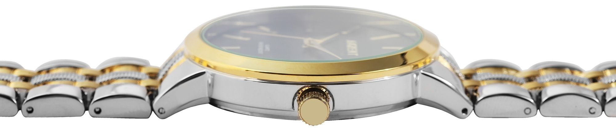 Het analoge herenpolshorloge met 3 wijzers van het merk Akzent Exclusive heeft een hoogwaardig kwartsuurwerk. De zilver- en goudkleurige metalen armband is 22 mm breed bij de lug en kan worden geopend en gesloten met een zilverkleurige clipsluiting. De totale lengte van het horloge is 22 cm. De zilver- en goudkleurige metalen kast met mineraalglas heeft een diameter van 42 mm en een kasthoogte van 10 mm. De achterkant van de kast is van roestvrijstaal en het horloge heeft een waterdichtheid van 3 bar. De wijzerplaat is zwart en de wijzers en cijfers zijn ook goudkleurig. Ze passen goed bij de algehele look van het horloge. Het horloge maakt indruk met zijn eenvoudige elegantie en kan op verschillende manieren worden gecombineerd.