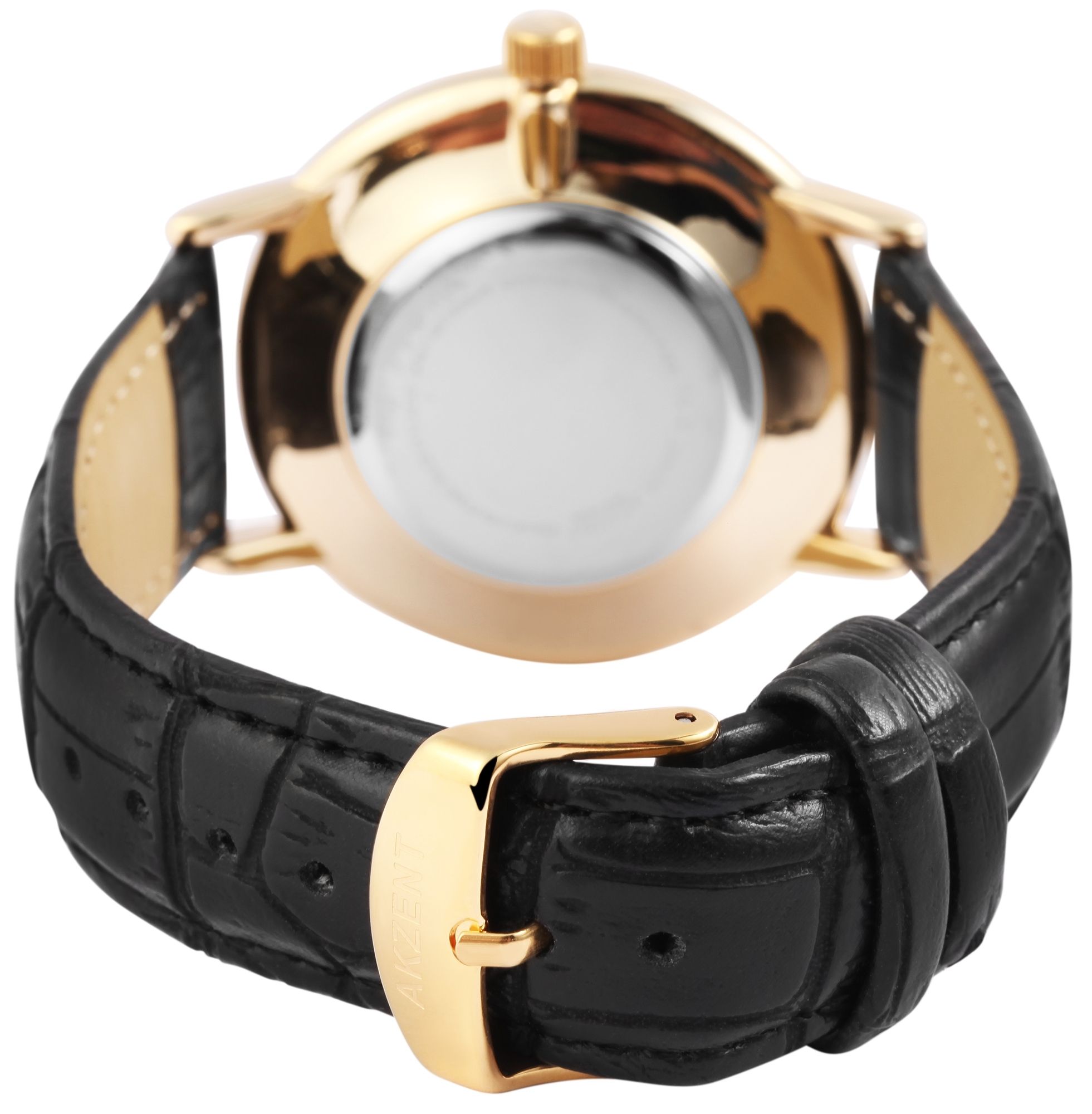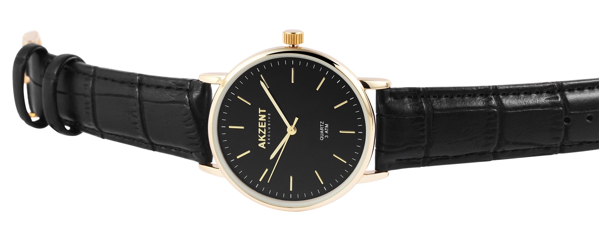 Het analoge herenpolshorloge met 3 wijzers van het merk Akzent Exclusive heeft een hoogwaardig kwartsuurwerk. De zwarte imitatieleren band is 20 mm breed bij de lug en kan worden geopend en gesloten met een goudkleurige gesp. De totale lengte van het horloge is 24,5 cm. De goudkleurige metalen kast met mineraalglas heeft een diameter van 40 mm en een kasthoogte van 8 mm. De achterkant van de kast is van roestvrij staal en het horloge heeft een waterdichtheid van 3 bar. De wijzerplaat is ook zwart. Net als de kast zijn de wijzers en indexen goudkleurig en passen ze goed bij de algehele look van het horloge. Het horloge maakt indruk met zijn eenvoudige elegantie en kan op verschillende manieren worden gecombineerd.