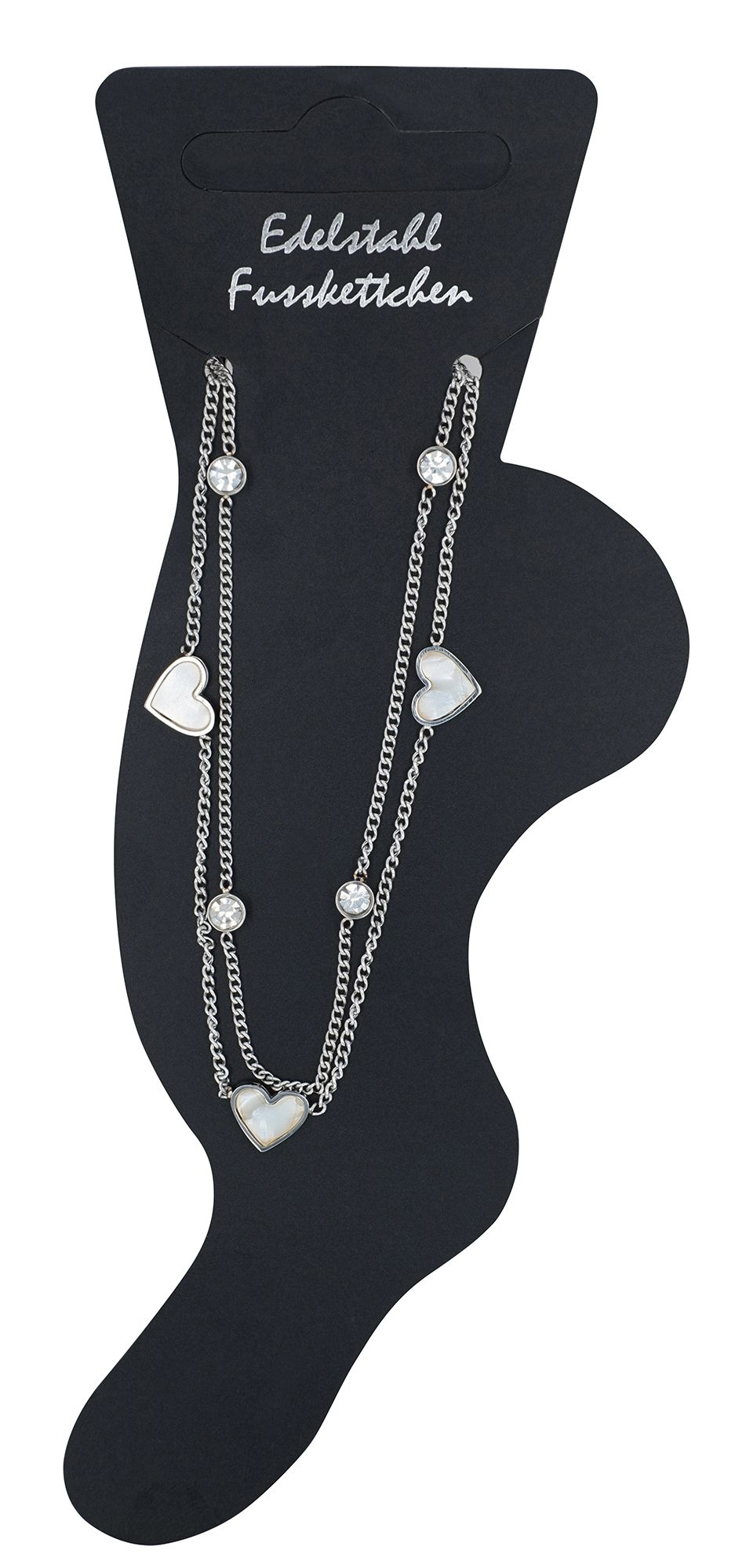 Ons accent enkelbandje is gemaakt van roestvrij staal en bestaat uit twee kettingen die harmonieus met elkaar verbonden zijn. De ene ketting is versierd met een rij hartjes met parelmoer garnering en de tweede ketting heeft drie ronde elementen met similé garnering. Het enkelbandje is in totaal 21,5 cm lang en bevat ook een verlengkettinkje van 5 cm dat flexibel verstelbaar is en voor optimaal draagcomfort zorgt. De enkelband wordt gesloten met een robuuste karabijnsluiting, die zorgt voor een veilige en duurzame sluiting.