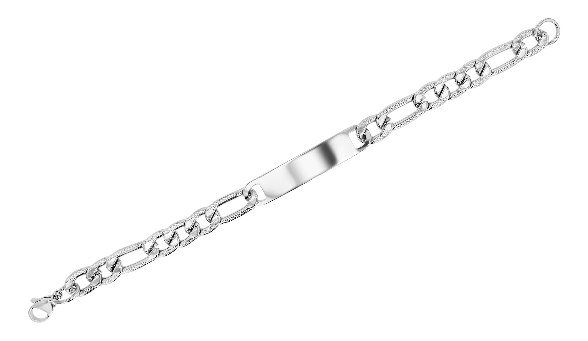 De Figaro armband van het merk Akzent is 21 cm lang, 9 mm breed en 2,5 mm dik - de perfecte combinatie van kracht en subtiliteit. Gemaakt van roestvrij staal belooft het niet alleen robuuste duurzaamheid, maar ook tijdloze schoonheid die de tand des tijds zal doorstaan. De speciale rangschikking van de kettingelementen wordt gekenmerkt door een afwisselende opeenvolging van langwerpige en ovale schakels, wat de armband een opvallende en toch elegante charme geeft. Gesloten met een karabijnsluiting, biedt de Figaro armband niet alleen een veilige houvast, maar is ook gemakkelijk te hanteren. Het graveerplaatje, 50 mm lang en 10 mm breed, biedt ruimte voor persoonlijke boodschappen, of het nu een naam, een datum of een betekenisvolle inscriptie is.