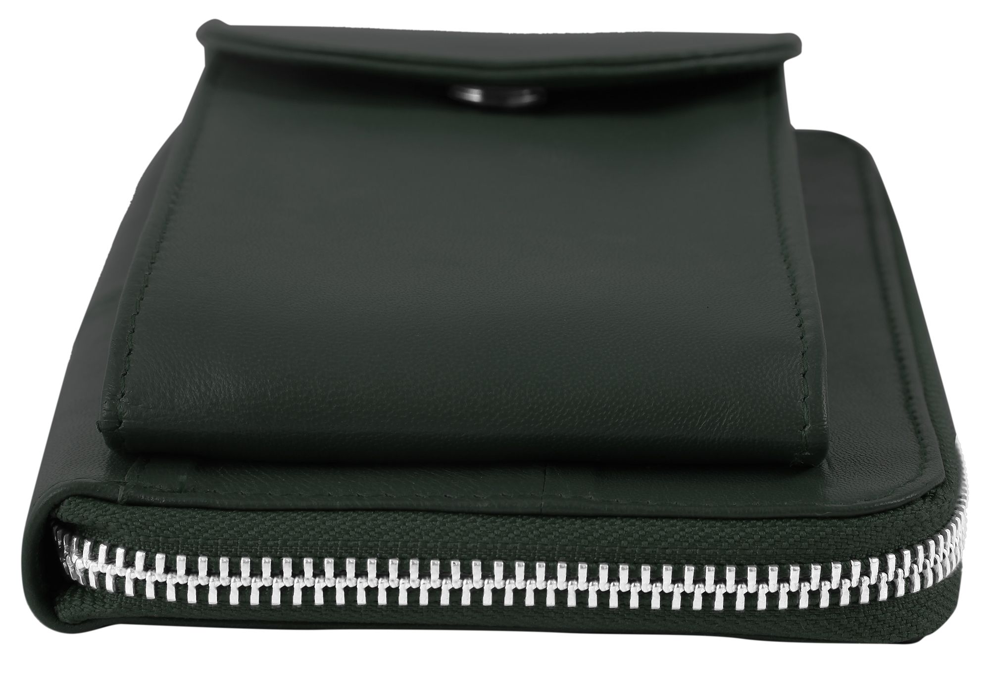 Productinformatie "Akzent Handyumhängetasche mit Geldbörse aus Echtleder, geeignet für iPhone 15, dunkelgrün"