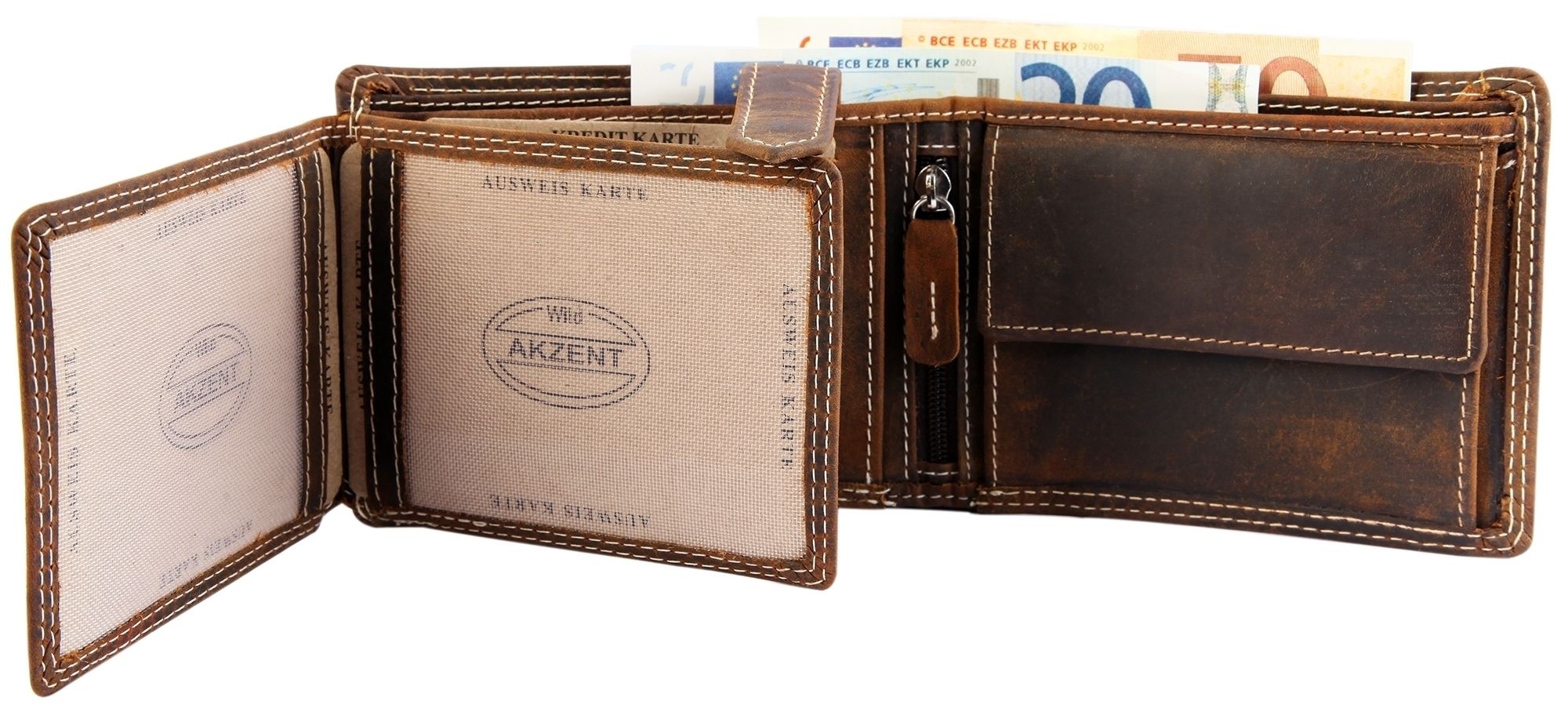De Akzent portemonnee is gemaakt van echt leer in liggend formaat. Hij bestaat uit twee biljetvakken, een muntvak en een uitbreidbaar kaartvak. De biljetvakken bevinden zich aan de achterkant, het muntvak aan de rechterkant. Er zijn drie kaartvakken aan de linkerkant van de portemonnee, die toegankelijk zijn vanaf de bovenkant. Achter de kaartsleuven bevinden zich twee praktische vakjes voor ID-kaarten. De leren portemonnee met kaartsleuven en ID-vakjes kan twee keer naar links worden geopend en wordt ook gesloten met een drukknoop. Onder het tweede ID-kaartvak en aan de achterkant zitten nog meer kaartvakjes. Daaronder en onder het muntvak zitten twee grote insteekvakken. De afmetingen zijn 10,2 cm lang, 12,5 cm breed en 2,5 cm hoog.