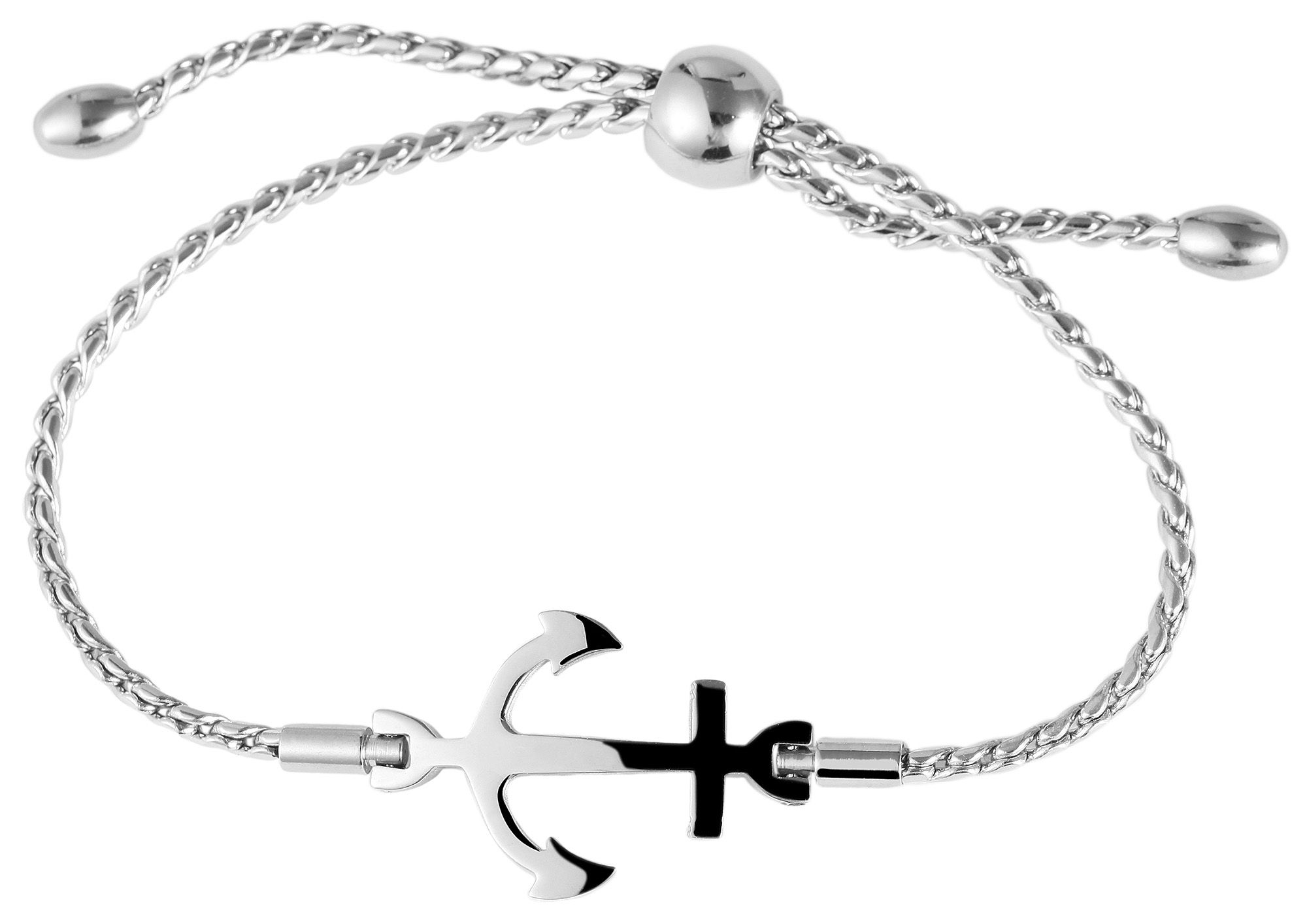 De koordarmband van het merk Akzent is gemaakt van roestvrij staal. Het heeft een lengte van 22,5 cm en een breedte van 1,4 cm. Hij is zilverkleurig en kan in maat worden versteld met een treksluiting. Als bijzonderheid heeft de armband een anker in het midden.