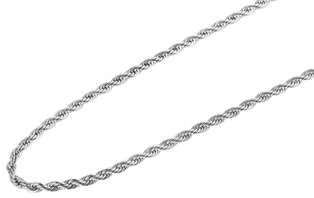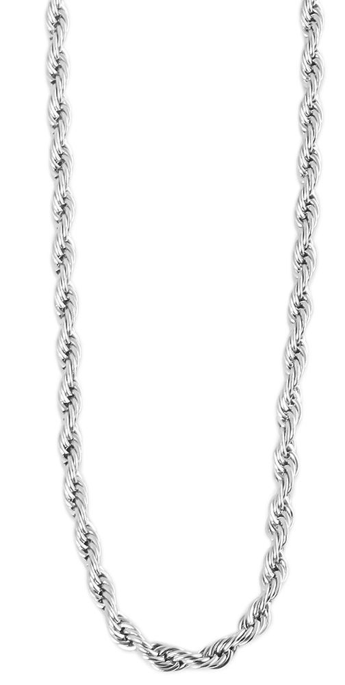 De zilverkleurige koordketting van het merk Akzent is gemaakt van roestvrij staal en is verkrijgbaar in lengtes van 40 cm, 42 cm, 45 cm, 50 cm, 55 cm en 60 cm, met een kettingdikte van 2 mm. Het materiaal is aanslagbestendig, robuust en duurzaam. De ketting bestaat uit twee strengen ketting die in elkaar gedraaid zijn om het typische koordpatroon van dit type ketting te creëren, een klassiek, elegant kettingontwerp.