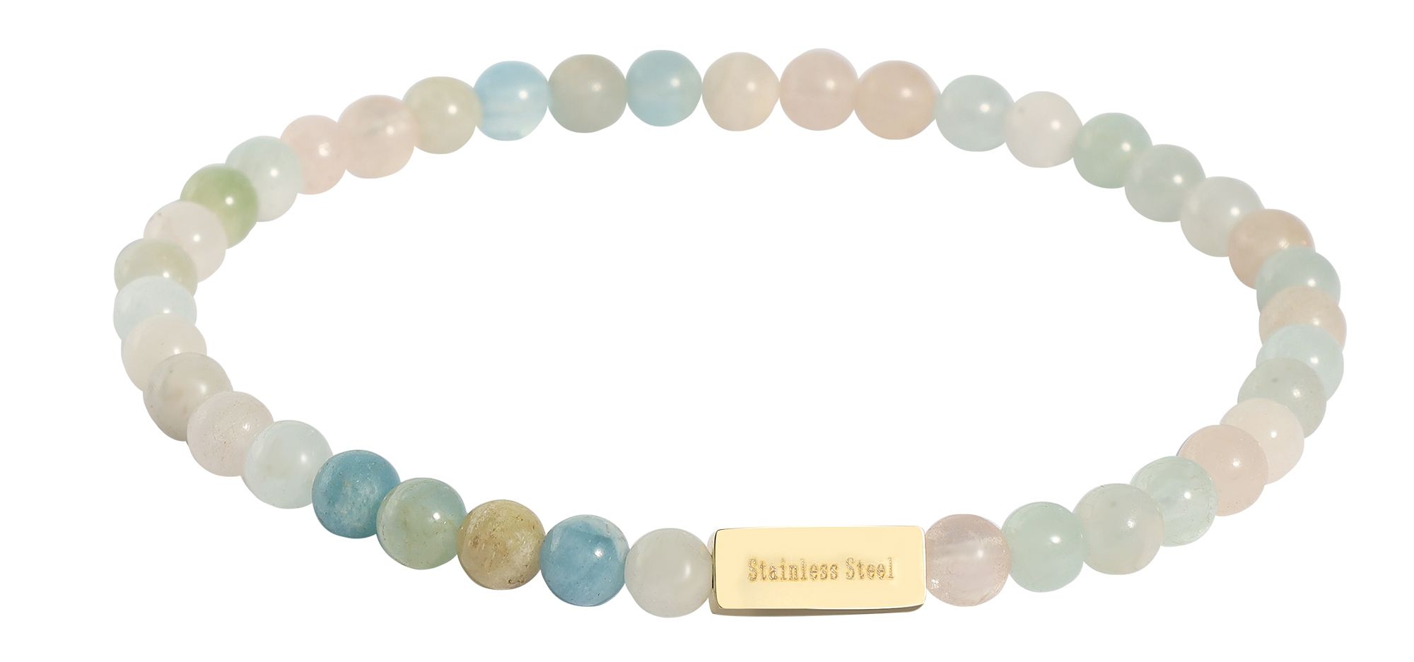 Productinformatie "Akzent Kugelarmband, Naturstein (morganite), gravurfähiges Edelstahlelement - goldfarben"